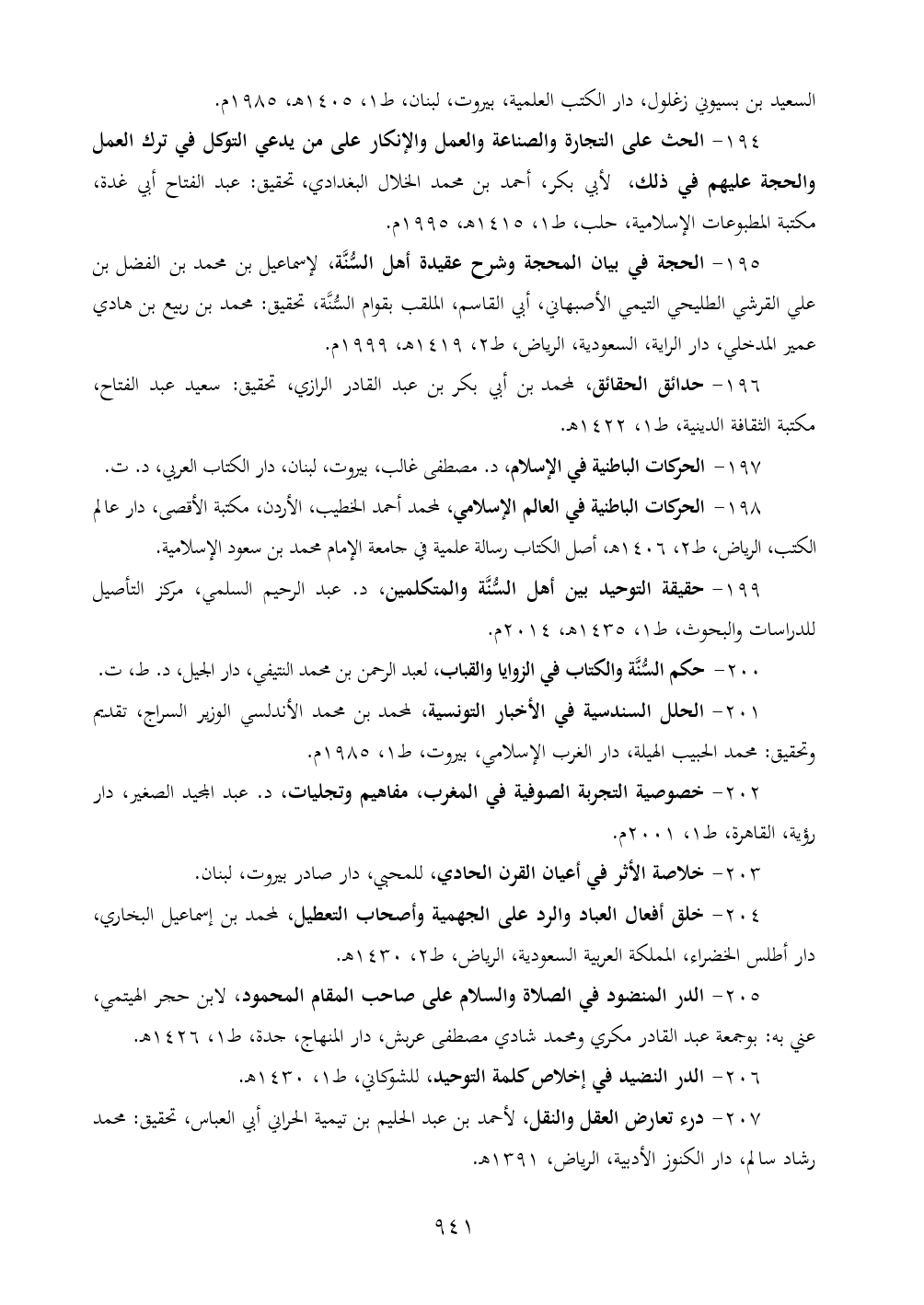 ١٩٥ - الحجة في بيان المحجة وشرح عقيدة أهل السُّنَّة، لإسماعيل بن محمد بن الفضل بن علي القرشي الطليحي التيمي الأصبهاني، أبي القاسم، الملقب بقوام السُّنَّة، تحقيق: محمد بن ربيع بن هادي عمير المدخلي، دار الراية، السعودية، الرياض، ط ٢، ١٤١٩ هـ، ١٩٩٩ م.