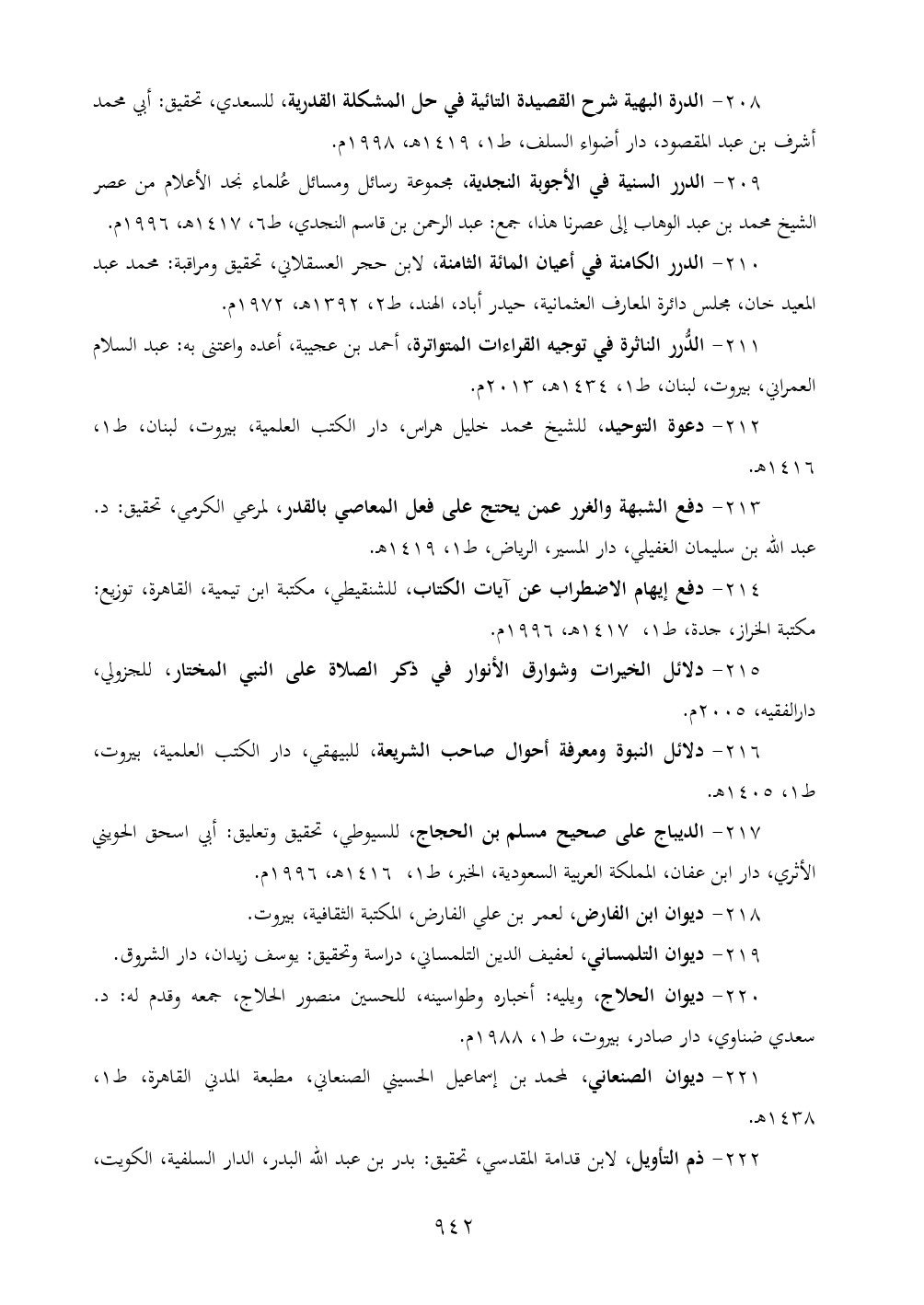 ٢٠٨ - الدرة البهية شرح القصيدة التائية في حل المشكلة القدرية، للسعدي، تحقيق: أبي محمد أشرف بن عبد المقصود، دار أضواء السلف، ط ١، ١٤١٩ هـ، ١٩٩٨ م.
