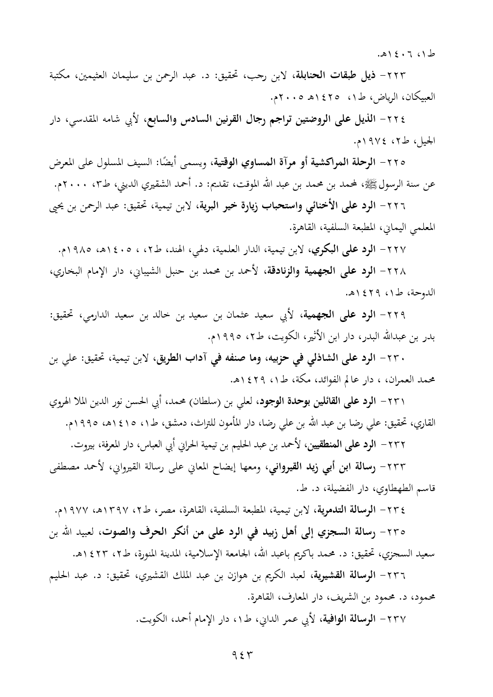 ٢٣٠ - الرد على الشاذلي في حزبيه، وما صنفه في آداب الطريق، لابن تيمية، تحقيق: علي بن محمد العمران،، دار عالم الفوائد، مكة، ط ١، ١٤٢٩ هـ.