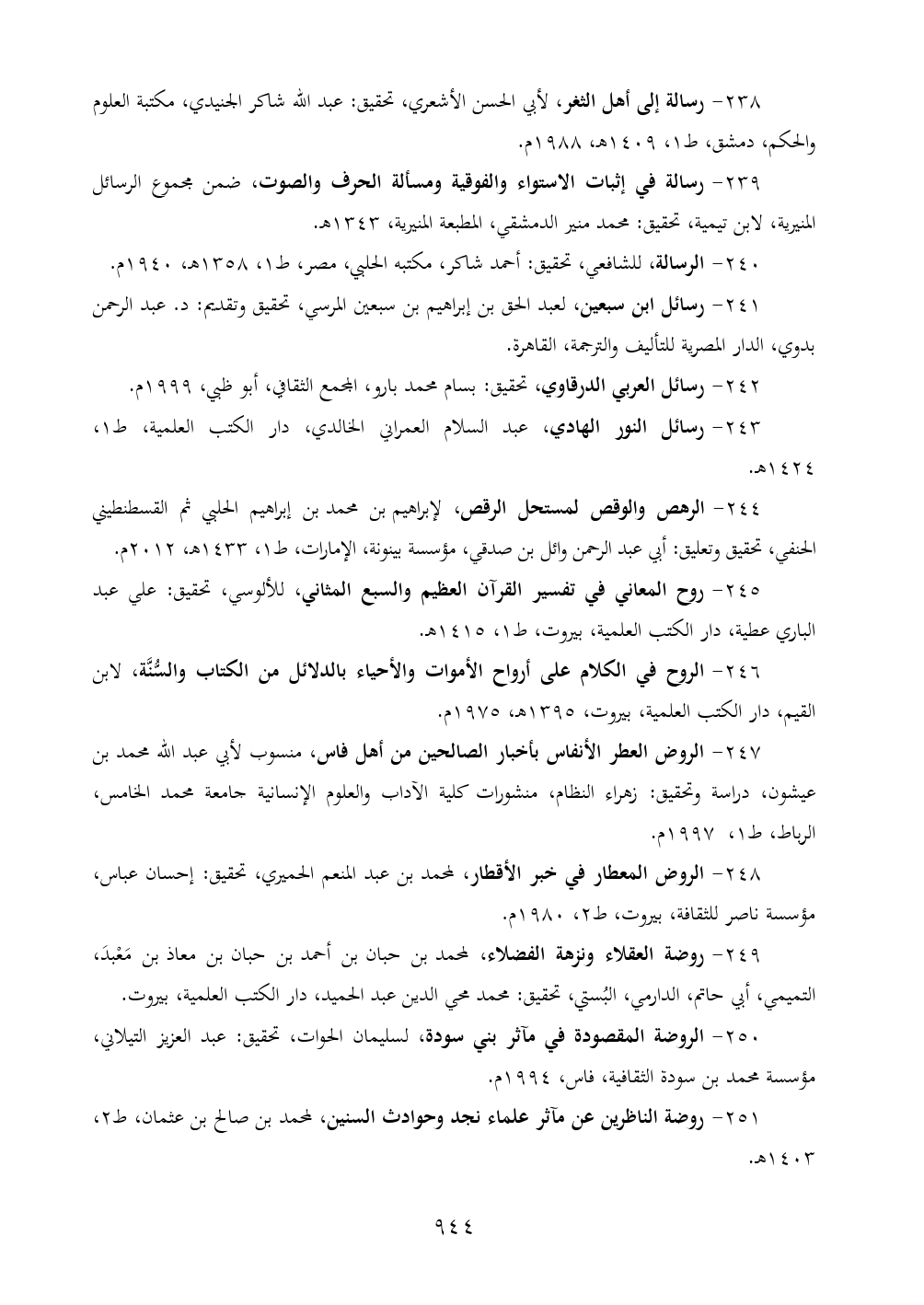 ٢٣٨ - رسالة إلى أهل الثغر، لأبي الحسن الأشعري، تحقيق: عبد الله شاكر الجنيدي، مكتبة العلوم والحكم، دمشق، ط ١، ١٤٠٩ هـ، ١٩٨٨ م.