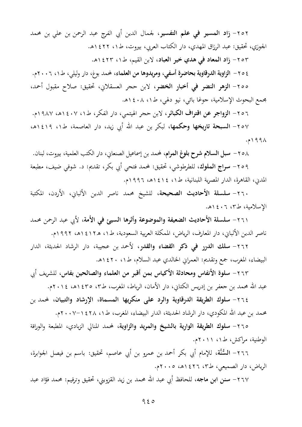 ٢٦٤ - سلوك الطريقة الدرقاوية والرد على منكريها المسماة، الإرشاد والتبيان، لمحمد بن محمد بن عبد الله المكودي، دار الرشاد الحديثة، الدار البيضاء، المغرب، ط ١، ١٤٢٨ - ٢٠٠٧ م.
