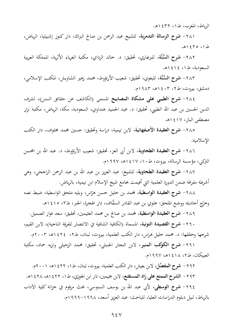 ٢٨١ - شرح الرسالة التدمرية، للشيخ عبد الرحمن بن صالح البراك، دار كنوز إشبيليا، الرياض، ط ١، ١٤٢٥ هـ.