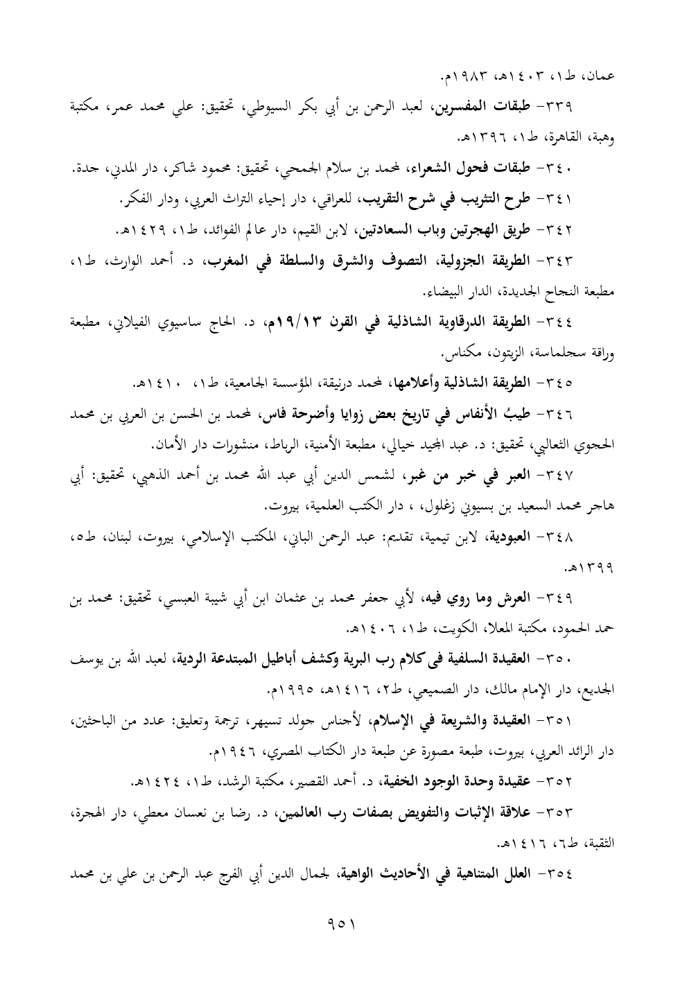 ٣٥٠ - العقيدة السلفية فى كلام رب البرية وكشف أباطيل المبتدعة الردية، لعبد الله بن يوسف الجديع، دار الإمام مالك، دار الصميعي، ط ٢، ١٤١٦ هـ، ١٩٩٥ م.