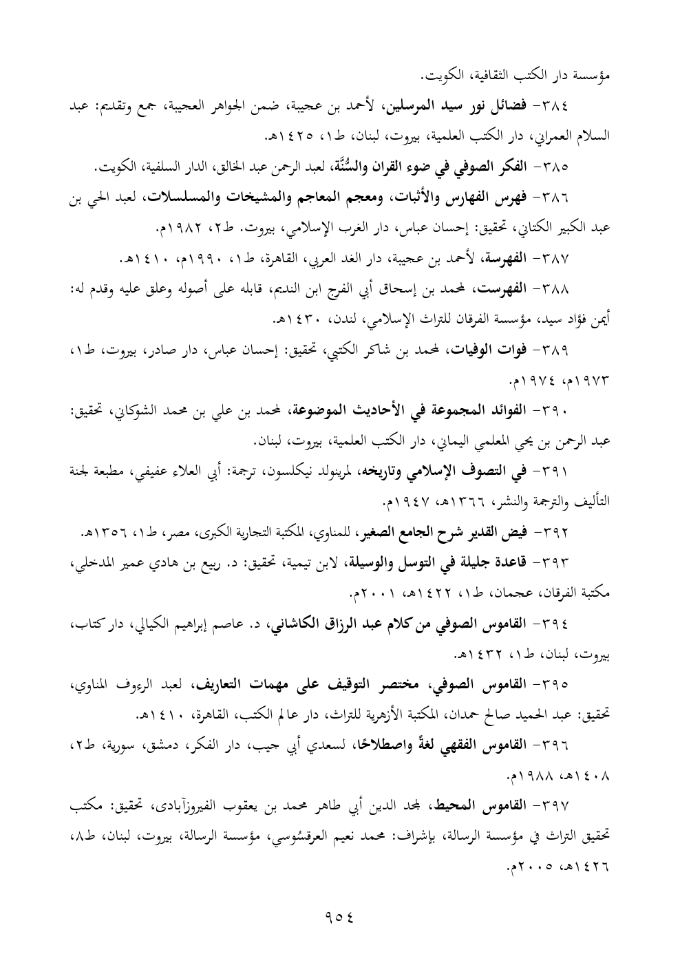 ٣٩٥ - القاموس الصوفي، مختصر التوقيف على مهمات التعاريف، لعبد الرءوف المناوي، تحقيق: عبد الحميد صالح حمدان، المكتبة الأزهرية للتراث، دار عالم الكتب، القاهرة، ١٤١٠ هـ.