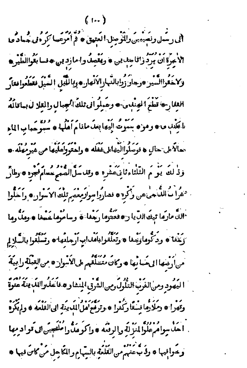 فوصلوا إليها على غفلة، واحتووا عليها من غير مهلة، وذلك يوم الثلاثاء ثاني عشره، وقد سل الصبح حسام فجره، وطار غراب الدجى عن وكره، فصاروا سوار معصم تلك الأسوار، وأحلوا الدمار هاتيك الديار، فعموها رجفاً، وساموها خسفاً، وهدوها زحفاً، ودكوها وجفاً، وتعلقوا بأهداب أرجائها وتسلقوا بالسلالم من أرضها إلى سمائها، وكان متسلقهم على الأسوار، من القبلة رابية اليهود، ومن الغرب التلول، ومن الشرق المنشار، فأخذوا المدينة عنوة وقسراً، وملؤها فسقاً وكفرا، وترفع أهل المدينة إلى القلعة، ولم يكره أحد سواهم علو المنزلة والرفعة، واكوهدوا ملتجئين إلى قوادمها وخوافيها، وذب عنهم من القلعة بالسهام والمكاحل من كان فيها،