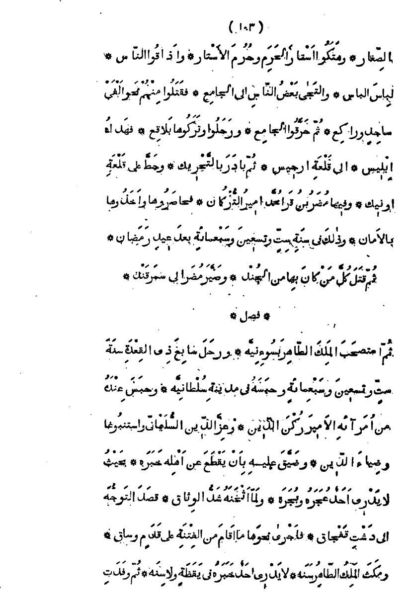 الصغار، وهتكوا أستار الحرم وحرم الأستار، وأذاقوا الناس لباس البأس، والتجأ بعض الناس إلى الجامع، فقتلوا منهم نحو ألفي ساجد وراكع، ثم حرقوا الجامع، ورحلوا وتركوها بلاقع، فهداه إبليس إلى أخذ قلعة أرجيس ثم بادر بالتحريك وحط على قلعة أونيك وفيها مصر بن قرا محمد أمير التركمان، فحاصرها وأخذها بالأمان، وذلك في سنة ست وتسعين وسبعمائة بعد عيد رمضان، ثم قتل كل من كان بها من الجند، وصير مصر إلى سمرقند " فصل " ثم استصحب الملك الظاهر بسوء نية ورحل سابع ذي القعدة سنة ست وسبعين وسبعمائة، وحبسه في مدينة سلطانية، وحبس عنده من أمرائه الأمير ركن الدين وعز الدين السليماني واسنبوغا وضياء الدين وضيق عليه بأن يقطعوا عن أهله خبره، بحيث لا يدري أحد عجره وبجره، ولما أثخنه وشد الوثائق قصد التوجه إلى دشت قبجاق، فأجرى نحوها ما أقام من الفتنة على قدم وساق، ومكث الملك الظاهر سنة لا يدري أحد خبره في يقظة ولا سنة ثم وفدت