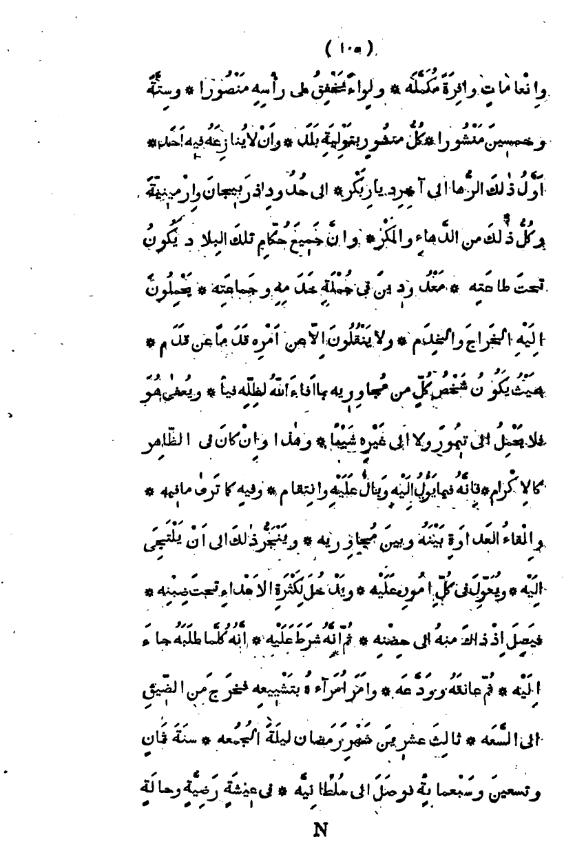 وإنعامات وافرة مكملة، ولواء يخفق على رأسه منصوراً وستة وخمسين منشورا، كل منشور بتولية بلد، وأن لا ينازعه فيه أحد، أول ذلك الرها إلى آخر ديار بكر إلى حدود أذربيجان وأرمينية وكل ذلك من الدهاء والمكر وأن جميع حكام تلك البلاد يكونون تحت طاعته معدودين في جملة خدمه وجماعته، يحملون إليه الخراج والخدم، ولا ينقلون إلا عن أمره قدماً عن قدم، بحيث يكون شخص كل منهم من مجاوريه بما أفاء الله عليهم لظله فيئا، ويعفى هو فلا يحمل إلى تيمور ولا غيره شيئاً، وهذا وإن كان في الظاهر كالإكرام، فإنه فيما يؤول إليه وبال عليه وانتقام، وفيه كما ترى ما فيه، وإلقاء العداوة بينه وبين مجاوريه، وينجر ذلك إلى أن يلتجي إليه ويعول في كل أموره عليه، ويدخل لكثرة الأعداء تحت ضبنه، فيصل إذ ذاك منه إلى حصنه ثم إنه شرط عليه أنه كلما طلبه جاء إليه، ثم عانقه وودعه، وأمر أمراءه لتشييعه فخرج من الضيق إلى السعة، لثالث عشر شهر رمضان ليلة الجمعة، سنة ثمان وتسعين وسبعمائة، فوصل إلى سلطانية، في عيشة رضية، وحالة