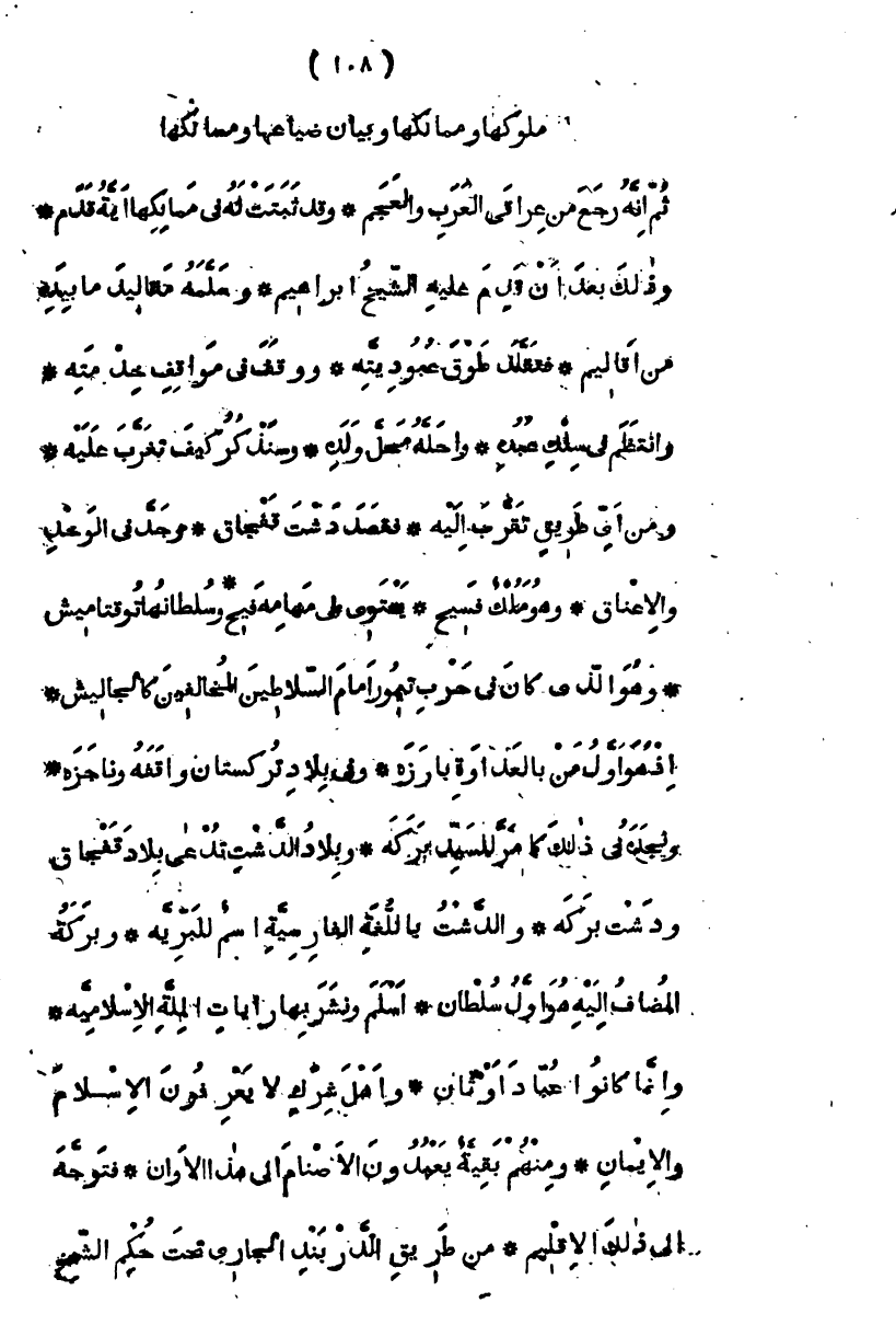 ثم إنه رجع من عراقي العرب والعجم، وقد ثبتت له في ممالكها أية قدم، وذلك بعد أن قدم عليه الشيخ إبراهيم وسلمه مقاليد ما بيده من أقاليم، وتقلد طوق عبوديته، ووقف في مواقف خدمته، وانتظم في سلك عبده، وأحله محل ولده، وسنذكر كيف تغرب عليه، ومن أي طريق تقرب إليه فقصد دشت قبجاق وجد في الوخد والأعناق وهو ملك فسيح، يحتوي على مهامه فيح، وسلطانها توقتاميش، وهو الذي كان في حرب تيمور أمام السلاطين المخالفين كالجاليش إذ هو أول من بالعداوة بارزه، وفي بلاد تركستان واقفه وناجزه، ونجده في ذلك كما مر السيد بركة وبلاد الدشت تدعى دشت قبجاق ودشت بركة، والدشت باللغة الفارسية اسم للبرية، وبركة المضاف إليه هو أول سلطان أسلم ونشر بها رايات الملة الإسلامية، وإنما كانوا عباد أوثان، وأهل شرك لا يعرفون الإسلام والإيمان، ومنهم بقية يعبدون الأصنام إلى هذا الأوان فتوجه إلى ذلك الإقليم من طريق الدربند الجاري تحت حكم الشيخ