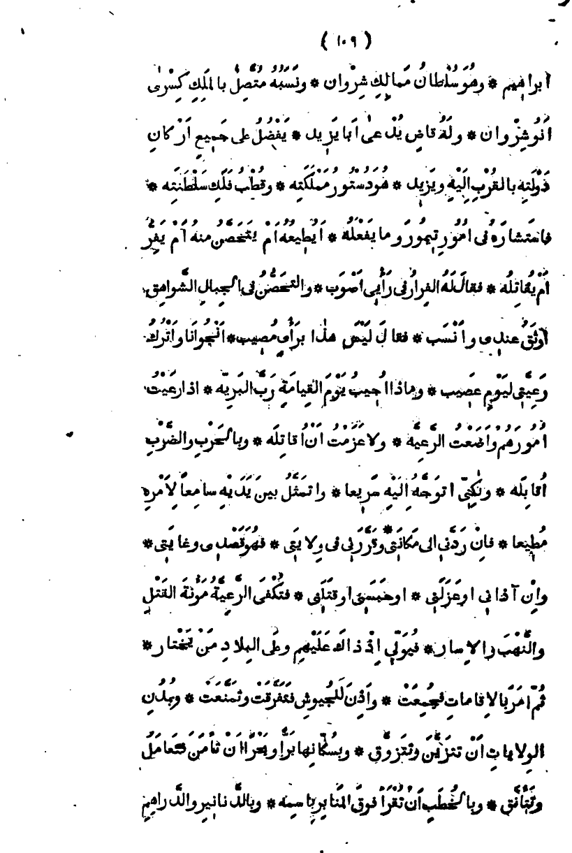 إبراهيم، وهو سلطان ممالك شروان، ونسبه متصل بالملك كسرى أنو شروان، وله قاض يدعى أبا يزيد، يفضل على جميع أركان دولته بالقرب إليه ويزيد، وهو دستور مملكته، وقطب سلطنته فاستشار في أمور تيمور وما يفعله، أيطيعه أم يتحصن منه أم يفر أم يقاتله؟ فقال له الفرار في رأيي أصوب، والتحصن في الجبال الشواهق أوثق عندي وأعجب فقال ليس هذا برأي مصيب، أنجو أنا وأترك رعيتي ليوم عصيب، وماذا أجيب يوم القيامة رب البرية، إذا رعيت أمورهم وأضعت الرعية، ولا عزمت أن أقاتله، وبالحرب والضرب أقابله، ولكني أتوجه إليه سريعاً، وأتمثل بين يديه سامعاً لأمره مطيعا، فإن ردني إلى مكانتي، وقررني في ولايتي، فهو قصدي وغايتي، وإن أذاني أو عزلني أو حبسني أو قتلني، فتكفي الرعية مؤنة القتل والنهب والأسار، فيولي إذ ذاك عليهم وعلى البلاد من يختار، ثم أمر بالاقامات فجمعت، وأذن للجيوش فتفرقت وتمنعت، وبمدن الولايات أن تتزين وتتزوق، وبسكانها براً وبحراً أن تأمن فتتعامل وتتأنق، وبالخطب أن تقرأ فوق المنابر باسمه، وبالدنانير والدراهم