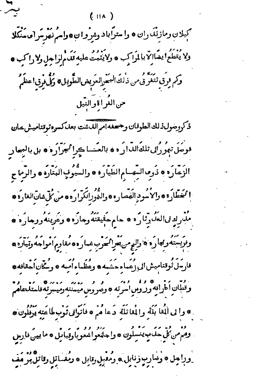 فوصل تيمور إلى تلك الداره، بالعساكر الجرارة، بل بالبحار الزخاره ذوي السهام الطيارة والسيوف البتارة والرماح الخطارة والأسود الهصارة والنمور الكرارة، من كل شان الغارة مدرك في العدو ثاره حام حقيقته وجاره وعرينه ووجاره وفريسته ونجاره وألج من بحر الحرب غماره، مقاوم أمواجه وتياره فأرسل توقتاميش إلى زعماء حشمه، وعظماء أممه وسكان أحقافه وقطان أطرافه ورؤوس أسرته وضروس ميمنته وميسرته، فاستدعاهم وإلى المقابلة والمقاتلة دعاهم، فأتوا في ثوب طاعته يرفلون " وهم من كل حدب ينسلون " واجتمعوا شعوباً وقبائل ما بين فارس وراجل وضارب ونابل ومقبل وقابل وفاتك وقاتل، بمرهف