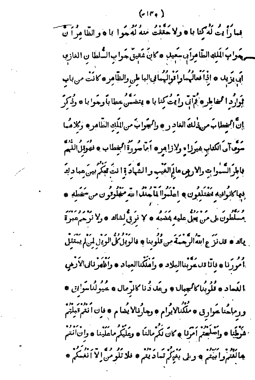 فما رأيت له كتاباً، ولا حققت منه له جوابا، والظاهر أن جواب الملك الظاهر أبي سعيد، كان شقيق جواب السلطان الغازي أبي يزيد، إذ أفعالهما وأقوالهما في الباطن والظاهر، كانت من توارد الخاطر، ثم إني رأيت كتاباً يتضمن خطاباً وجوابا، وذكر أن الخطاب من ذلك الغادر، والجواب من الملك الظاهر، وكلاهما سوى آي الكتاب غير زاه ولا زاهر، أما صورة الخطاب فهو " قل اللهم فاطر السموات والأرض عالم الغيب والشهادة أنت تحكم بين عبادك فيما كانوا فيه يختلفون " اعلموا أنا جند الله مخلوقون من سخطه مسلطون على من يحل عليه غضبه، لا نرق لشاك ولا نرحم عبرة باك، قد نزع الله الرحمة من قلوبنا، فالويل كل الويل لمن لم يمتثل أمورنا فإنا خربنا البلاد، وأهلكنا العباد، وأظهرنا في الأرض الفساد، قلوبنا كالجبال، وعددنا كالرمال، خيولنا سوابق، ورماحنا خوارق، وملكنا لا يرام، وجارنا لا يضام، فإن أنتم قبلتم شرطنا، وأصلحتم أمرنا، كان لكم ما لنا، وعليكم ما علينا، وإن أنتم خالفتم وأبيتم، وعلى بغيكم تماديتم، فلا تلومن إلا أنفسكم،