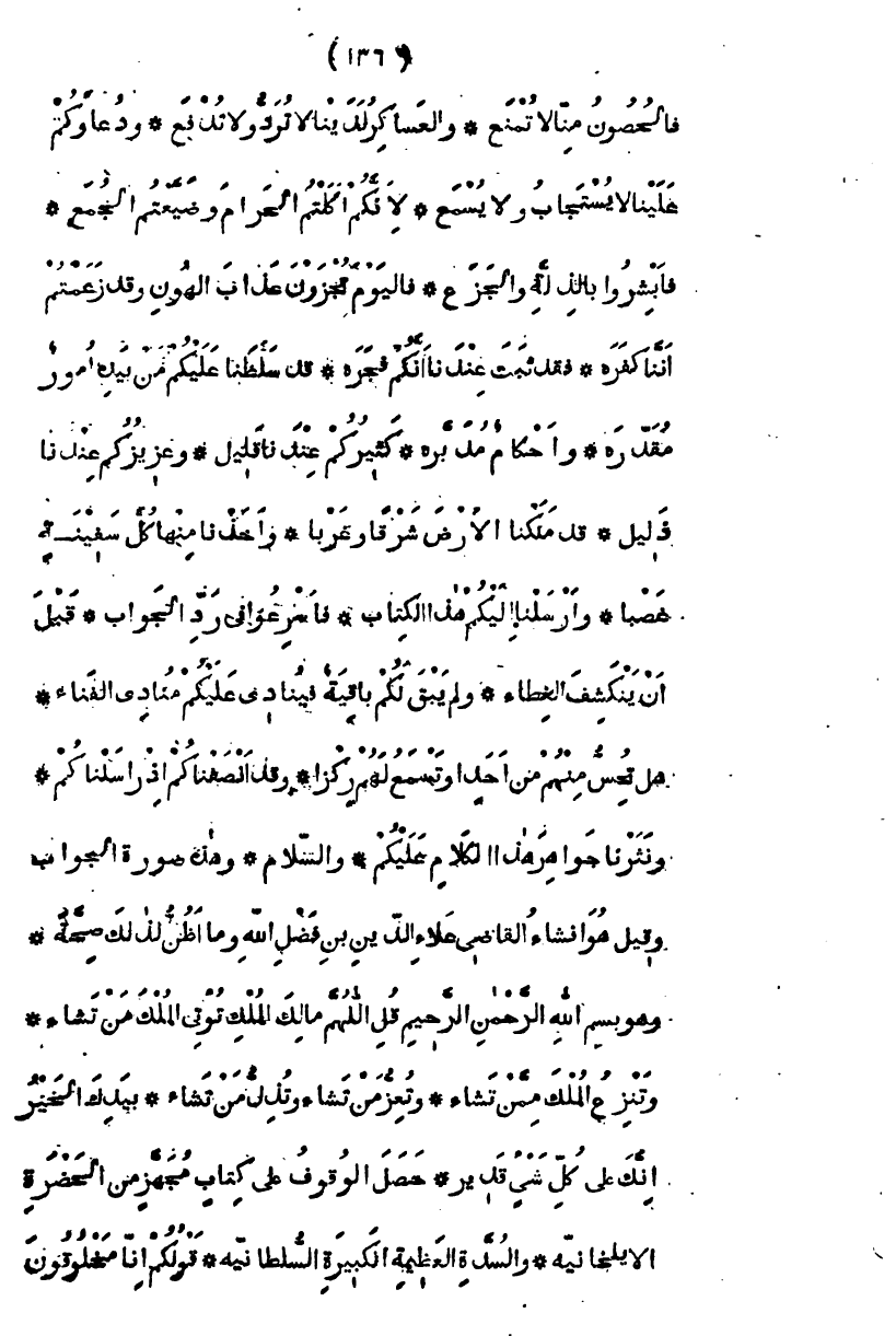 فالحصون منا لا تمنع، والعساكر لدينا لا ترد ولا تدفع، ودعاؤكم علينا لا يستجاب ولا يسمع، لأنكم أكلتم الحرام وضيعتم الجمع، فأبشروا بالذلة والجزع، فاليوم تجزون عذاب الهون، وقد زعمتم أننا كفرة، فقد ثبت عندنا أنكم فجرة، قد سلطنا عليكم إله له الأمور مقدرة، والأحكام مدبرة، كثيركم عندنا قليل، وعزيزكم عندنا ذليل، قد ملكنا الأرض شرقاً وغرباً، وأخذنا منها كل سفينة غصباً، وأرسلنا إليكم هذا الكتاب، فأسرعوا في رد الجواب، قبل أن ينكشف الغطاء، ولم يبق لكم باقية، فينادي عليكم منادي الفناء " هل تحس منهم من أحد أو تسمع لهم ركزا " وقد أنصفناكم إذ راسلناكم، ونثرنا جواهر هذا الكلام عليكم والسلام وهذه صورة الجواب وقيل هو إنشاء القاضي بدر الدين بن علاء الدين بن فضل الله وما أظن لذلك صحة وهو " بسم الله الرحمن الرحيم " قل اللهم مالك الملك تؤتي الملك من تشاء وتنزع الملك ممن تشاء وتعز من تشاء وتذل من تشاء، بيدك الخير إنك على كل شيء قدير " حصل الوقوف على كتاب مجهز من الحضرة الأيلخانية، والسدة العظيمة الكبيرة السلطانية قولكم إنا مخلوقون