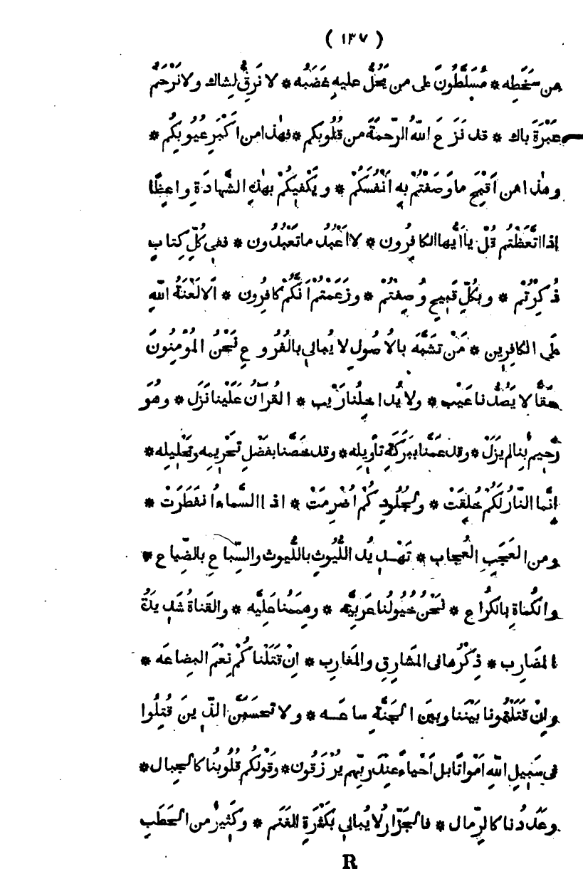 من سخطه، مسلطون على من يحل عليه غضبه، لا نرق لشاك، ولا نرحم عبرة باك، قد نزع الله الرحمة من قلوبكم فهذا من أكبر عيوبكم، وهذا من أقبح ما وصفتم به أنفسكم، ويكفيكم بهذه الشهادة واعظاً إذا اتعظتم " قل يا أيها الكافرون، لا أعبد ما تعبدون " ففي كل كتاب ذكرتم، وبكل قبيح وصفتم، وزعمتم أنكم كافرون، ألا لعنة الله على الكافرين من تشبه بالأصول، لا يبالي بالفروع نحن المؤمنون لا يصدنا عيب، ولا يداخلنا ريب، القرآن علينا نزل، وهو رحيم بنا ولم يزل، وقد عمنا ببركة تأويله، وقد خصنا بفضل تحريمه وتحليله إنما النار لكم خلقت، ولجلودكم أضرمت " إذا السماء انفطرت " ومن العجب العجاب تهديد الليوث باللتوت، والسباع بالضباع، والكماة بالكراع نحن خيولنا بحرية، وهممنا علية، والقناة شديدة المضارب، ذكرها في المشارق والمغارب، إن قتلناكم نعم البضاعة، وإن قتلتمونا بيننا وبين الجنة ساعة " ولا تحسبن الذين قتلوا في سبيل الله أمواتاً بل أحياء عند ربهم يرزقون " وقلكم قلوبنا كالجبال، وعددنا كالرمال فالجزار لا يبالي بكثرة الغنم، وكثير من الحطب