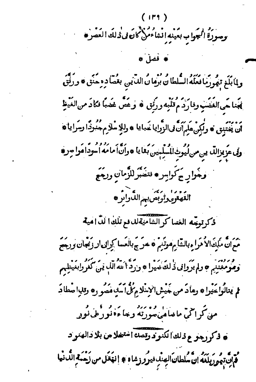 وصورة الجواب بعينه إنشاء من كان في ذلك العصر " فصل " ولما بلغ تيمور ما فعله السلطان برهان الدين بقصاده حنق، ورتق بجناحي الغضب وفار دم قلبه ورنق، وغص غضباً فكاد من الغيظ أن يختنق، ولكن علم أن في الزوايا خبايا، وللإسلام جنوداً وسرايا، وفي عرين الدين من ليوث المسلمين بقايا، وأن أمامه أسوداً هواصر، وجوارح كواسر، فتصبر للزمان، ورجع القهقرى وتربص منهم الدوائر