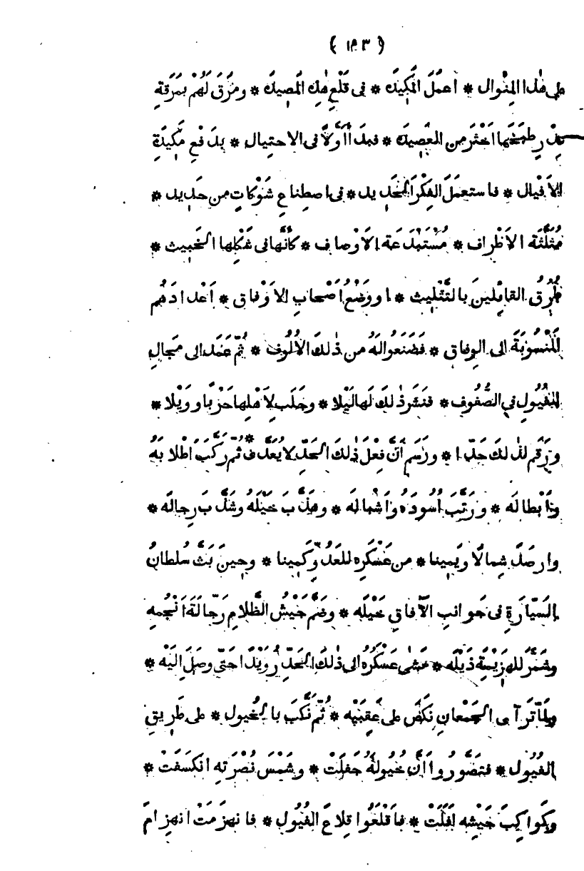 على هذا المنوال أعمل المكيدة، في قلع هذه المصيدة، ومرق لهم بمرقة قدر طبخها أخثر من العصيدة، فبدأ أولاً في الاحتيال، بدفع مكيدة الأفيال، فاستعمل الفكر الحديد، في اصطناع شوكات من حديد، مثلثة الأطراف، مستبعدة الأوصاف، كأنها في شكلها الخبيث، طرق القائلين بالتثليث، أو وضع أصحاب الأوفاق، أعدادهم المنسوبة إلى الوفاق، فصنعوا له من ذلك الألوف ثم عمد إلى مجال الفيول في الصفوف فنشر ذلك لها ليلاً، وجلب لأهلها حرباً وويلا، ورفم لذلك حدا، ورسم أن فعل ذلك الحد لا يعدى، ثم ركب أطلابه وأبطاله، ورتب أسوده وأشباله، وهذب خيله وشذب رجاله، وأرصد شمالاً ويمينا، من عسكره للعدو كمينا، وحين بث سلطان السيارة في جوانب الآفاق خيله، وضم جيش الظلام رجاله أنجمه وشمر للهزيمة ذيله، مشى عسكره إلى ذلك الحد رويداً حتى وصل إليه، ولما تراءى الجمعان نكص على عقبيه، ثم نكب بالخيول، عن طريق الفيول، فتصوروا أن خيوله جفلت، وشمس نصرته انكشفت، وكواكب جيشه أفلت، فأقلعوا قلاع الفيول، فانهمرت انهمار