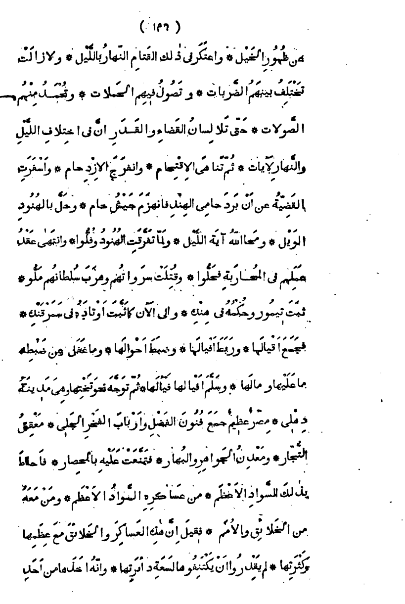 عن ظهور الخيل، واعتكر في ذلك القتام النهار بالليل، ولا زالت تختلف بينهم الضربات وتصول فيهم الحملات، وتحمل منهم الصولات، حتى تلا لسان القضاء والقدر " إن في اختلاف الليل والنهار لآيات " ثم تناهى الاقتحام، وانفرج الازدحام، وأسفرت القضية عن أن برد حامى الهند فانهزم جيش حام، وحل بالهنود الويل، ومحا الله آية الليل ولما تفرقت الهنود وفلوا، وانتهى عقد عملهم في المحاربة فحلوا، وقتلت سرواتهم وهرب سلطانهم ملوا، وثبت تيمور وحكمه في هنده، إلى الآن كما ثبت أوتاده في سمرقنده، فجمع أقيالها، وربط أفيالها، وضبط أحوالها، وما غفل عن ضبط ما عليها وما لها، وسلم أفيالها فيالها
