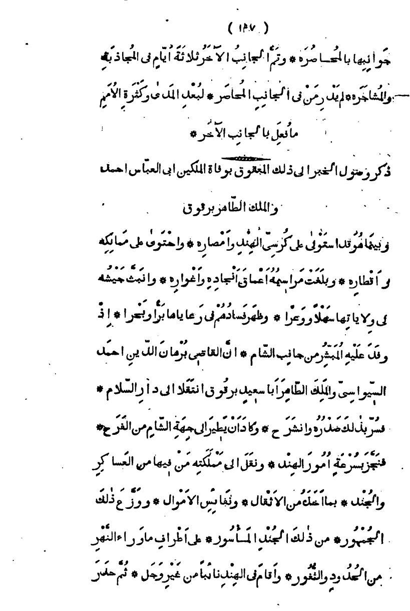 وبينا هو استولى على كرسي الهند وأمصاره، واحتوى على ممالكه وأقطاره، وبلغت مراسيمه ذرا أنجاده، وأعماق أغواره، وانبث جيشه في ولاياتها سهلاً ووعرا، وظهر فساده في رعاياها براً وبحراً إذ وفد عليه المبشر من جانب الشام، أن القاضي برهان الدين أحمد السيواسي والملك الظاهر أبا سعيد برقوق انتقلا إلى دار السلام، فسر بذلك وانشرح، وكاد أن يطير إلى جهة الشام من الفرح فنجز بسرعة أمور الهند، ونقل إلى مملكته من فيها من العساكر والجند، بما أخذه من الأثقال، ونفائس الأموال، ووزع ذلك الجمهور، وسائر الجند المأسور، على أطراف ما وراء النهر من الحدود والثغور، وأقام في الهند نائباً من غير وجل ثم صدر