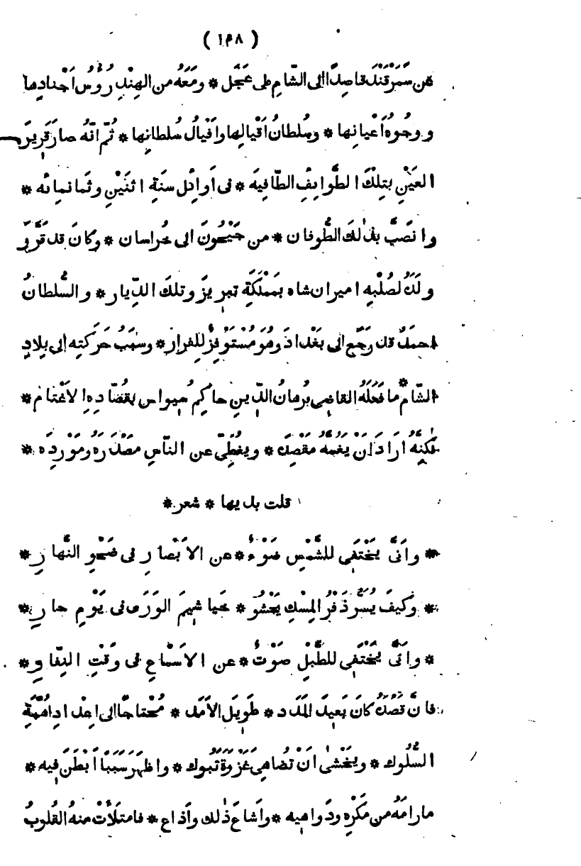 عن سمرقند قاصداً إلى الشام على عجل، ومعه من الهند رؤوس أجنادها ووجوه أعيانها، وسلطان أفيالها وأفيال سلطانها، ثم توجه قرير العين بتلك الطوائف الطافية، في أوائل سنة اثنتين وثمانمائة، وانصب بذلك الطوفان، من جيحون إلى خراسان، وكان قد قرر ولده لصلبه أميران شاه بمملكة تبريز وتلك الديار، والسلطان أحمد قد رجع إلى بغداد وهو مستوفز للفرار، وسبب حركته إلى بلاد الشام " وإن كان في إهلاك الحرث والنسل مالكي الالتزام " ما فعله القاضي برهان الدين حاكم سيواس بقصاده الأغتام، لكنه أراد أن يغم مقصده، ويغطي عن الناس مصدره ومورده قلت بديها