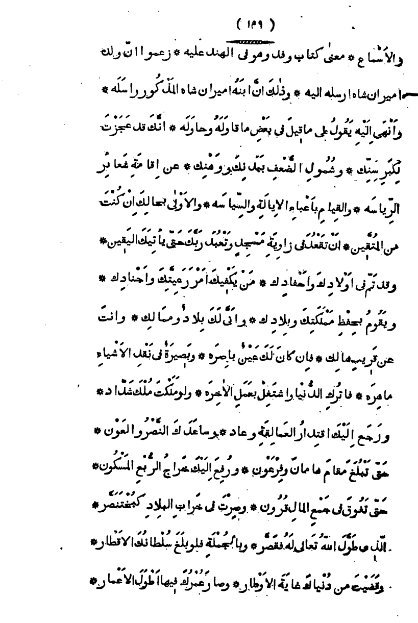 وذلك أن ابنه أميران شاه المذكور راسله، وأنهى إليه يقول على ما قيل في بعض ما قاوله وحاوله، إنك قد عجزت لكبر سنك، وشمول الضعف ببدنك ووهنك، عن إقامة شعائر الرياسة، والقيام بأعباء الإيالة والسياسة، والأولى بحالك إن كنت من المتقين، أن تقعد في زاوية مسجد وتعبد ربك حتى يأتيك اليقين، وقد تم في أولادك وأحفادك، من يكفيك أمر رعيتك وأجنادك، ويقوم بحفظ مملكتك وبلادك، وأنى لك بلاد وممالك؟ وأنت عن قريب هالك فإن كان لك عين باصرة، وبصيرة في نقد الأشياء ماهرة، فاترك الدنيا واشتغل بعمل الآخرة، ولو ملكت ملك شداد، ورجع إليك اقتدار العمالقة وعاد، وساعدك النصر والعون، حتى تبلغ مقام هامان وفرعون، ورفع إليك خراج الربع المسكون، حتى تفوق في جمع المال قارون، وحدث في خراب البلاد كبختنصر، الذي طول الله تعالى له فقصر وبالجملة فلو بلغ سلطانك الأقطار، وقضيت من دنياك غاية الأوطار، وصار عمرك فيها أطول الأعمار،