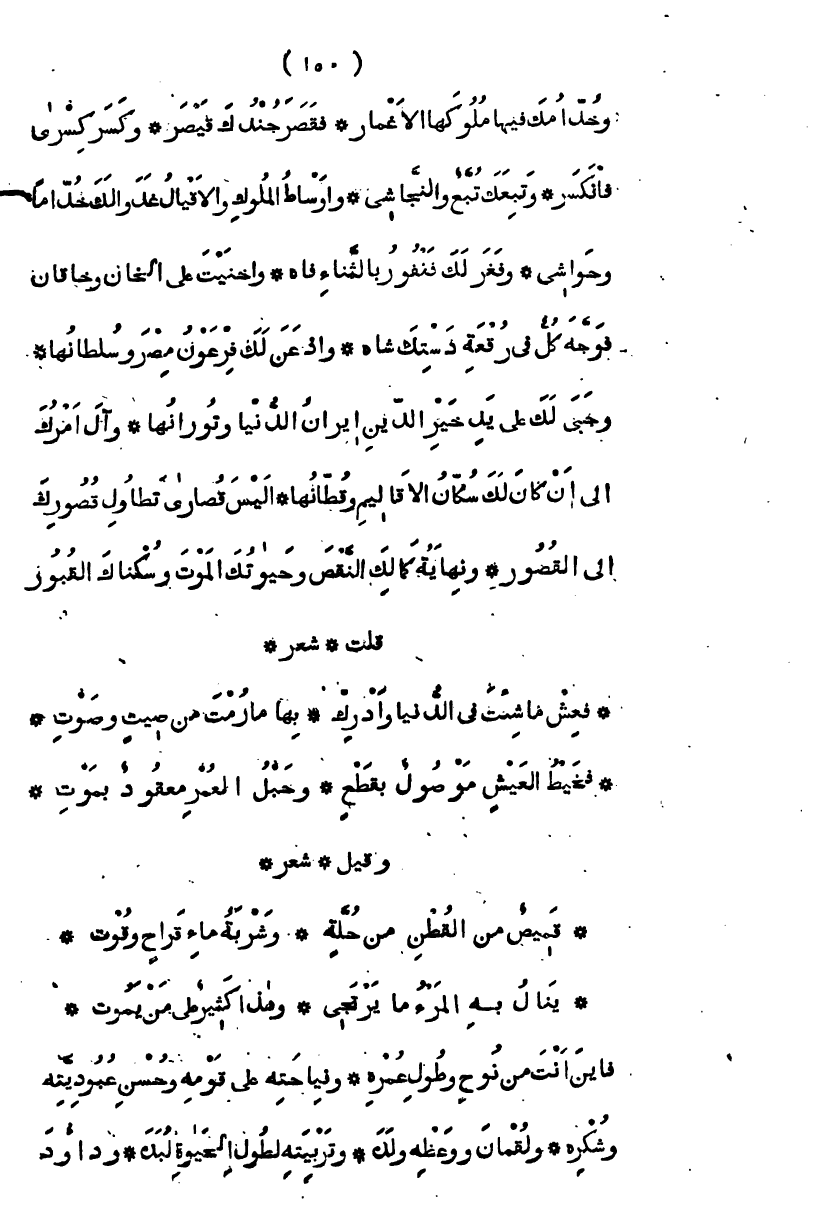 وخدامك فيها ملوكها الأغمار، فقصر جندك قيصر وكسر كسرى فانكسر، وتبعك تبع والنجاشي، وأوساط الملوك والأقيال غدوا لك خداماً وحواشي، وغفر لك فغفور بالثناء فاه، وأخنيت على الخان وخاقان فوجه كل رقعة دستك شاه، وأذعن لك فرعون مصر وسلطانها وجبى لك على يد جببو الدين إيران الدنيا وتورانها، وآل أمرك إلى أن دان لك سكان الأقاليم وقطانها، أليس قصارى تطاول قصورك إلى القصور، ونهاية كمالك النقص وحياتك الموت وسكناك القبور؟ قلت