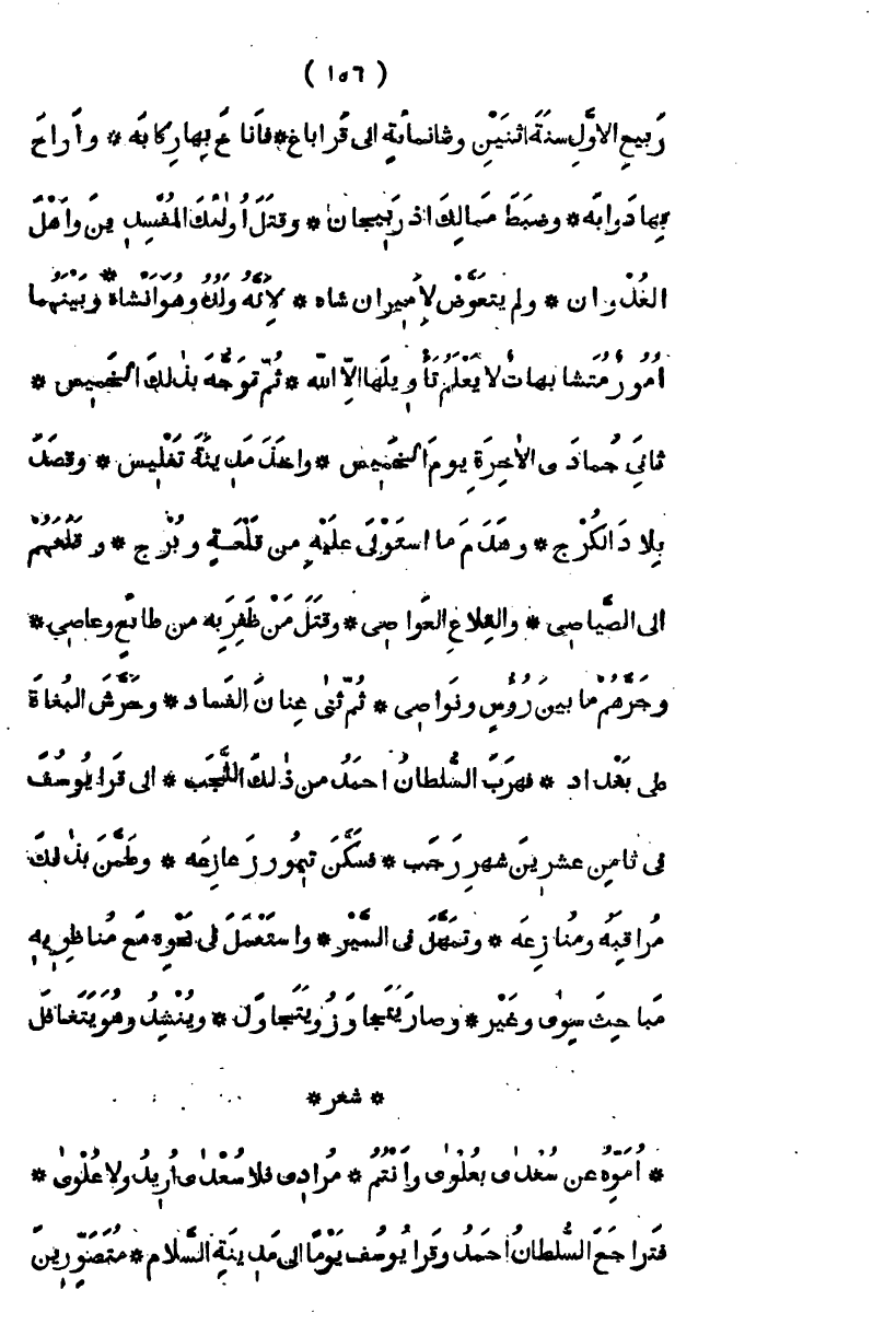 ربيع الأول سنة اثنتين وثمانمائة إلى قراباغ، فأناخ بها ركابه، وأراح بها دوابه، وضبط ممالك أذربيجان، وقتل أولئك المفسدين وأهل العدوان، ولم يتعرض لأميران شاه، لأنه ولده وهو أنشأه، وبينهما أمور متشابهات لا يعلم تأويلها إلا الله ثم توجه بذلك الخميس، ثاني جمادى الآخرة يوم الخميس، وأخذ مدينة تفليس وقصد بلاد الكرج، وهدم ما استولى عليه من قلعة وبرج، وقلعهم إلى الصياصي، والقلاع العواصي، وقتل من ظفر به من طائع وعاصي، وجرهم ما بين رؤوس ونواصي، ثم ثنى عنان العناد، وحرش البغاة على بغداد، فهرب السلطان أحمد من ذلك اللجب، إلى قرا يوسف في ثامن عشري شهر رجب فسكن تيمور زعازعه، وطمن ذلك مراقبه ومنازعه، وتمهل في السير، واستعمل في نحوه مع مناظره مباحث سوى وغير، وصار يتحازر ويتحاول وينشد وهو يتغافل