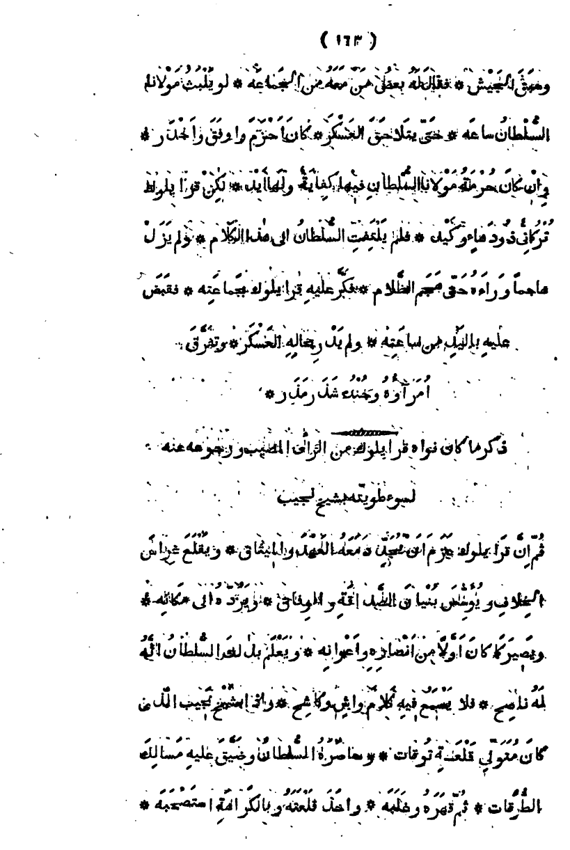 وسبق الجيش، فقال له بعض من معه من الجماعة لو يلبث مولانا السلطان ساعة، حتى يتلاحق العسكر، كان أحزم وأوفق وأجدر، وإن كانت حرمة مولانا السلطان فيها كفاية ولها أيد، لكن قرايلوك تركماني ذو دهاء وكيد، فلم يلتفت السلطان إلى هذا الكلام، ولم يزل هاجماً وراءه حتى هجم الظلام، فكر عليه قرايلوك بجماعته، فقبض عليه باليد من ساعته، ولم يدر بحاله العسكر، وتفرق أمره وجنده شغر بغر