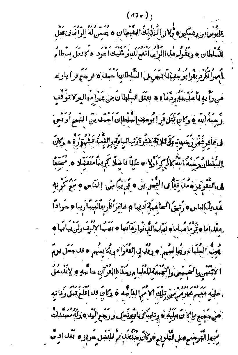 قابوس بن وشمكير، ولا زال ذلك الشيطان، يحسن له الرأي في قتل السلطان ويقول هذا الرأي أنفع لك وعليك أعود كما فعل بسطام أمير الكرد بقرا يوسف لما قبض على السلطان أحمد، فرجع قرايلوك عن رأيه لما خدعه ودهاه، فقتل السلطان من غير إهمال ولا توقف رحمه الله وكان قتل قرا يوسف السلطان أحمد ابن الشيخ أويس في عاشر شهر رجب سنة ثلاث عشرة وثمانمائة والقصة مشهورة وكان السلطان رحمه الله كما ذكر أولاً، عالماً فاضلاً كريماً متفضلاً، محققاً في التقرير، مدققاً في التحرير، قريباً من الناس، مع كونه شديد البأس، رقيق الحاشية أديباً، شاعراً ظريفاً لبيباً أريباً، جواداً مقداماً، قرماً هماماً، نهاب الدنيا وهابها، يهب الألوف ولن يهابها يحب العلماء ويجالسهم، ويدني الفقراء ويكايسهم، قد جعل يوم الاثنين والخميس والجمعة للعلماء وحفاظ القرآن خاصة، لا يدخل عليه معهم غيرهم من تلك الأمم الغاصة وكان قد أقلع قبل وفاته عن جميع ما كان عليه، وتاب إلى الله تعالى ورجع إليه، وله مصنفات منها الترجيح على التلويح