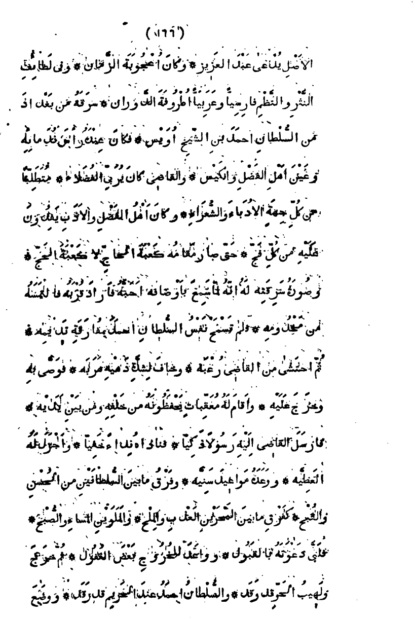 يدعى عبد العزيز، وكان أعجوبة الزمان، وفي لطائف الشعر والنظم فارسياً وعربياً أطروفة الدوران، سرقه من بغداد من السلطان أحمد بن الشيخ أويس، فكان عنده رأس ندمائه وعين أهل الفضل والكيس، والقاضي كان يربي الفضلاء، متطلباً من كل جهة الأدباء والشعراء، وكان أهل الفضل والأدب، يفدون عليه من كل فج وحتى صار مقامه كعبة الحاج لا كعبة الحج وصورة سرقته له أنه لما سمع بأوصافه أحبه، فأراد قربه، فالتمسه من مخدومه، فلم تسمح نفس السلطان أحمد بمفارقة نديمه، ثم اختشى من القاضي رغبة وخاف لشدة دهيه هربه، فوصى به وحرج عليه، وأقام له معقبات يحفظونه من خلفه ومن بين يديه، فأرسل القاضي إليه رسولاً ذكياً، فناداه نداء خفياً، وأجزل له العطية، ووعده مواعيد سنية وفرق ما بين السلطانين من الحسن والقبح، كفرق ما بين البحرين العذب والملح، والمبليين المساء والصبح، فلبى دعوته بالقبول، وواعد للخروج، بعض القفول، ثم خرج ولهيب الحر قد وقد، والسلطان أحمد عن الحريم قد رقد، ووضع ثيابه على ساحل دجلة، ووجه إلى داخل النهر في الطين رجله، ثم غاص في الماء ومخر، وخرج من مكان آخر، ولحق برفقائه، واختفى بينهم اختفاء اليربوع في نافقائه، فطلبه السلطان أحمد، ففتشوا عليه فلم يوجد، فبالغوا في طلابه، إلى أن وقفوا على ثيابه، ورأوا آثار رجليه في الطين، فلم يشكوا أن الموج اختطفه، فكان من المغرقين، فكفوا قدم السعي عن طلبه ولم يضيقوا على أحد بسببه ثم بعد أيام يسيرة، أخرج غريق بغداد رأسه بسيواس عند القاضي برهان الدين من تحت الحصيرة، فغرقه في أبحر نواله، وأسبغ عليه ذيل كرمه وأفضاله، فصار عنده مقدماً، ولديه مبجلاً معظماً، ألف له تاريخاً بديعاً، سلك فيه مهيعاً رفيعاً، وانتهج منهجاً منيعاً، ذكر فيه من بدء أمره إلى قرب وفاته، مع مواقفه ووقائعه ومصافاته، وشحه بظريف كناياته، ولطيف استعاراته، وفصيح لغاته، وبليغ كلماته، ورشيق إشاراته، ودقيق عباراته، مد فيه عنان اللسان، وهو موجود في ممالك قرمان، في أربع مجلدات ذكر ذلك لي من غاص بحره، واستخرج دره ووقف على تاريخ العتبى في اليمين، السلطان محمود بن سبكتكين، وأن هذا أحسن من ذلك أسلوباً، وأغزر يعبوبا، وأعذب شؤبوياً مع أني لم أقف عليهما، ولا وصلت لقصر الباع إليهما ثم إن الشيخ عبد العزيز هذا بعد لهيب هذه النائرة، انتقل إلى القاهرة، ولم يبرح على الإبراح، ومعاقرة راح الأتراح، حتى خامرته نشأة الوجد فصاح، وتردى من سطح عال فطاح، ومات منكسراً ميتة صاحب الصحاح، والله أعلم