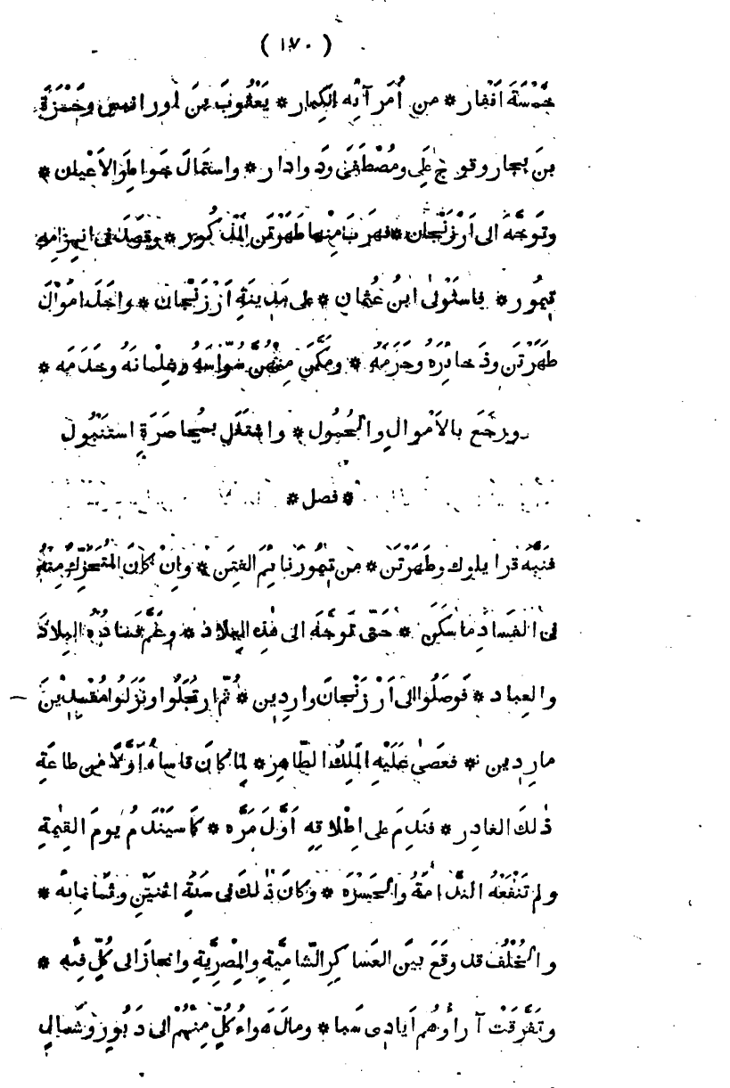 خمسة أنفار، من أمرائه الكبار يعقوب بن أورانيس، وحمزة بن بجار، وقوج علي، ومصطفى، وداودار، واستمال خواطر الأعيان، وتوجه إلى أرزنجان فهرب منها طهرتن المذكور وقصد في انهزامه تيمور فاستولى ابن عثمان على مدينة أرزنجان وأخذ أموال طهرتن وذخائره وحرمه، ومكن منهن سواسه وغلمانه وخدمه، ورجع بالأموال وبالحمول واشتغل بمحاصرة استنبول " فصل " فنبه قرايلوك وطهرتن، من تيمور نائم الفتن، وإن كان المتحرك منه في الفساد ما سكن، حتى توجه إلى هذه البلاد، وعم فساده البلاد والعباد، فوصلوا إلى أرزنجان وأردين، ثم ارتحلوا ونزلوا مفسدين ماردين، فعصى عليه الملك الظاهر، لما قاساه أولا من طاعة ذلك الغادر، فندم على إطلاقه أول مرة، كما سيندم يوم القيامة ولم تنفعه الندامة والحسرة، وكان ذلك في سنة اثنتين وثمانمائة، والخلف قد وقع بين العساكر الشامية والمصرية وانحاز إلى كل فئة، وتفرقت آرائهم أيادي سبا، ومال هواء كل منهم إلى دبور وشمال