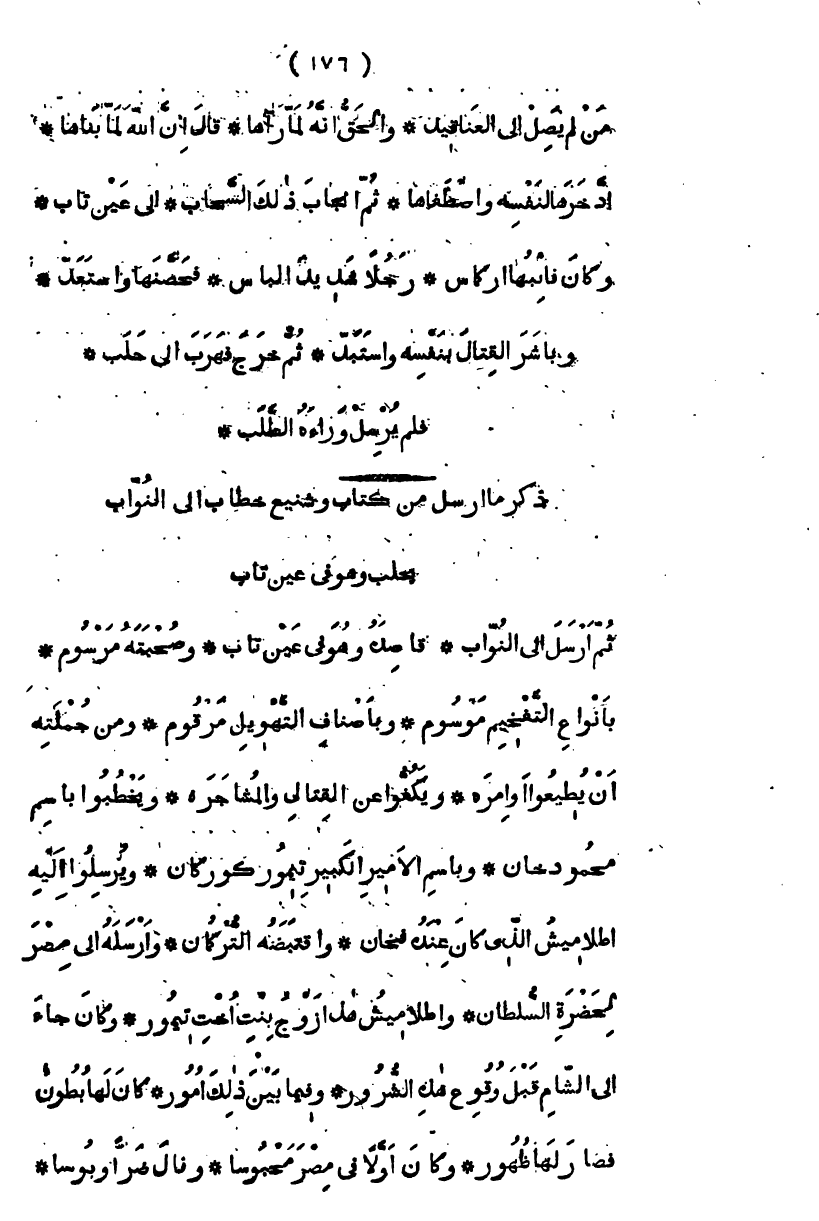 ثم أرسل إلى النواب، قاصده وهو في عين تاب، وصحبته مرسوم، بأنواع التفخم موسوم، وبأصناف التهويل مرقوم، ومن جملته أن يطيعوا أوامره، ويكفوا عن القتال والمشاجرة، ويخطبوا باسم محمود خان، وباسم الأمير الكبير تيمور كوركان، ويرسلوا إليه أطلاميش الذي كان عنده فخان، أو اقتنصه وأرسله إلى مصر التركمان وأطلاميش هذا زوج بنت أخت تيمور، وكان جاء إلى الشام قبل وقوع هذه الشرور، وفيما بين ذلك أمور، كان لها بطون فصار لها ظهور، وكان أولاً في مصر محبوساً، ونال ضراً وبوساً،