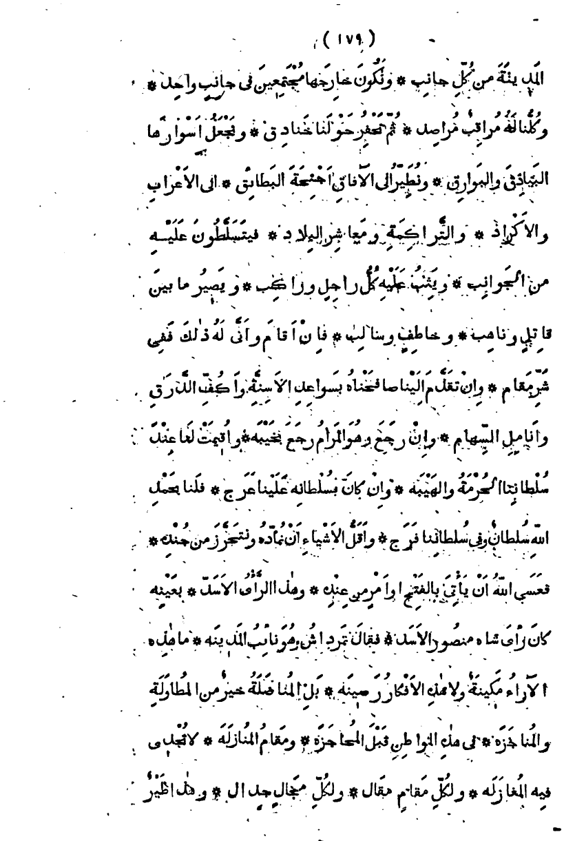 المدينة من كل جانب، ونكون خارجها مجتمعين في جانب واحد، وكلنا له مراقب مراصد ثم نحفر حولنا خنادق، ونجعل أسوارها البيارق والبوارق، ونطير إلى الآفاق أجنحة البطائق، إلى الأعراب والأكراد، والتراكمة وعشران البلاد فيتسلطون عليه من الجوانب، ويثب عليه كل راجل وراكب، ويصير ما بين قاتل وناهب، وخاطف وسالب، فإن أقام وأنى له ذلك ففي شر مقام، وإن تقدم إلينا صافحناه بسواعد الأسنة وأكف الدرق وأنامل السهام وإن رجع وهو المرام، رجع بخيبه، وأقيمت لنا عند سلطاننا الحزمة والهيبة، وإن كان لسلطانه علينا عرج، فلنا بحمد الله سلطان وفي سلطاننا فرج، وأقل الأشياء أن نماده ونتحرز من جنده " فعسى الله أن يأتي بالفتح أو أمر من عنده " وهذا الرأي الأسد، بعينه كان رأي شاه منصور الأسد فقال تمرداش وهو نائب المدينة ما هذه الآراء مكينة، ولا هذه الأفكار رصينة، بل المناضلة خير من المطاولة، والمناجزة في هذه المواطن قبل المحاجزة، ومقام المنازلة لا تجدي فيه المغازلة، ولكل مقام مقال، ولكل مجال جدال، وهذا طير