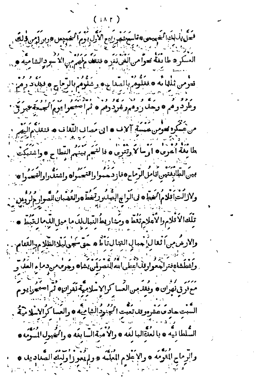 فحل بذلك الخميس، تاسع شهر ربيع الأول يوم الخميس، وبرز من ذلك العسكر، طائفة نحواً من ألفي نفر، فتقدم لهم من الأسود الشامية، نحو من ثلاثمائة، ففلوهم بالصفاح، وشلوهم بالرماح، فبددوهم، وطردوهم، وخددوهم وشردوهم، ثم أصحبوا يوم الجمعة، فبرز من عسكره نحو من خمسة آلاف، إلى مصاف النقاف، فتقدم لهم طائفة أخرى، أرسالا وتترى، فالتحم منهم النطاح، واشتبكت بين الطائفتين أنامل الرماح، فزدحموا واقتحموا، واستدوا والتحموا، ولا زالت أقلام الخط في ألواح الصدور تخط، والعضب الصمصام لرؤوس تلك الأقلام بالأعلام تقط، ومشاريط النبال لدماميل الدمال تبط، والأرض من أثقال جبال القتال تئط، حتى سجى ليلا الظلام والقتام وأغطشا، فتراجعوا وقد أعطى الله النصر لمن يشا، وأجرى من دماء العدو مع قويق نهران، وفقد من العساكر الإسلامية نفران ثم أصبحوا يوم السبت حادي عشر، وقد تعبت الجنود الشامية، والعساكر السلطانية، بالعدة البالغة، والأهبة السابغة، والخيول المسومة، والرماح المقومة، والأعلام المعلمة، ولم يعز أولئك الصناديد،
