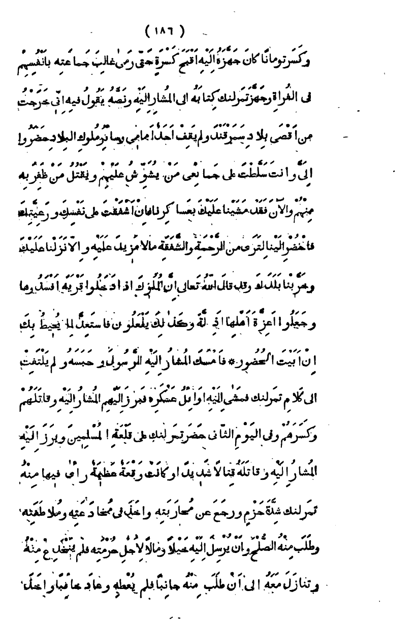 وكسر تومانا كان جهزه إليه أقبح كسره، حتى رمى غالب جماعته بأنفسهم في الفرات، وجهز تمرلنك كتابه إلى المشار إليه ونصه يقول فيه إني خرجت من أقصى بلاد سمرقند، ولم يقف أحد أمامي، وسائر ملوك البلاد حضروا إلي، وأنت سلطت على جمائعي من يشوش عليهم ويقتل من ظفر به منهم، والآن فقد مشينا عليك بعساكرنا، فإن أشفقت على نفسك ورعيتك، فاحضر إلينا لترى من الرحمة والشفقة ما لا مزيد عليه، وإلا نزلنا عليك وخربنا بلدك، وقد قال الله تعالى " إن الملوك إذا دخلوا قرية أفسدوها وجعلوا أعزة أهلها أذلة وكذلك يفعلون " فاستعد لما يحيط بك إن أبيت الحضور فأمسك المشار إليه الرسول وحبسه ولم يلتفت إلى كلام تمرلنك، فمشى إليه أوائل عسكره فبرز إليهم المشار إليه وقاتلهم وكسرهم وفي اليوم الثاني حضر تمرلنك على قلعة المسلمين فبرز إليه المشار إليه وقاتله قتالاً شديداً وكانت وقعة عظيمة، رأى فيها منه تمرلنك شدة حزم ورجع عن محاربته، وأخذ في مخادعته، وملاطفته، وطلب منه الصلح، وأن يرسل إليه خيلا ومالا لأجل حرمته، فلم ينخدع معه وتنازل معه إلى أن طلب منه جانبا فلم يعطه، وعاد خائباً، وأخذ