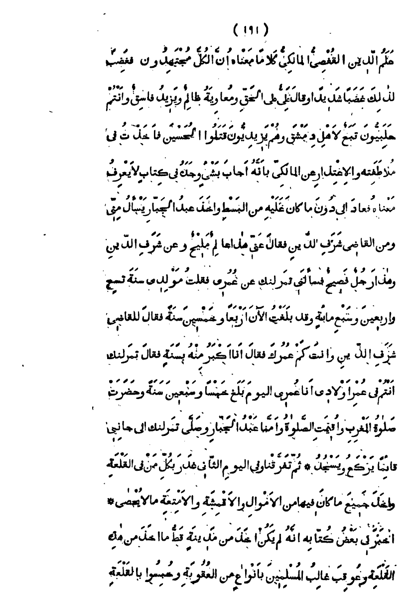 علم الدين القفصي المالكي كلاماً معناه أن الكل مجتهدون فغضب لذلك غضباً شديداً، وقال علي على الحق ومعاوية ظالم ويزيد فاسق وأنتم حلبيون تبع لأهل دمشق، وهم يزيديون قتلوا الحسين فأخذت في ملاطفته والاعتذار عن المالكي بأنه أجاب بشيء وجده في كتاب لا يعرف معناه، فعاد إلى دون ما كان عليه من البسط وأخذ عبد الجبار يسأل عني وعن القاضي شرف الدين فقال عني هذا عالم مليح وعن شرف الدين وهذا رجل فصيح فسألني تمرلنك عن عمري فقلت مولدي في سنة تسع وأربعين وسبع مائة وقد بلغت الآن أربعاً وخمسين سنة فقال للقاضي شرف الدين وأنت كم عمرك؟ فقال أنا أكبر منه بسنة فقال تمرلنك أنتم في عمر أولادي أنا عمري اليوم خمساً وسبعين سنة وحضر صلاة المغرب وأقيمت الصلاة وأمنا عبد الجبار وصلى تمرلنك إلى جانبي قائماً يركع ويسجد ثم تفرقنا وفي اليوم الثاني غدر بكل من في القلعة وأخذ جميع ما كان فيها من الأموال والأقمشة والأمتعة ما لا يحصى أخبرني بعض كتابه أنه لم يكن أخذ من مدينة قط ما أخذ من هذه القلعة، وعوقب غالب المسلمين بأنواع من العقوبة، وحبسوا بالقلعة
