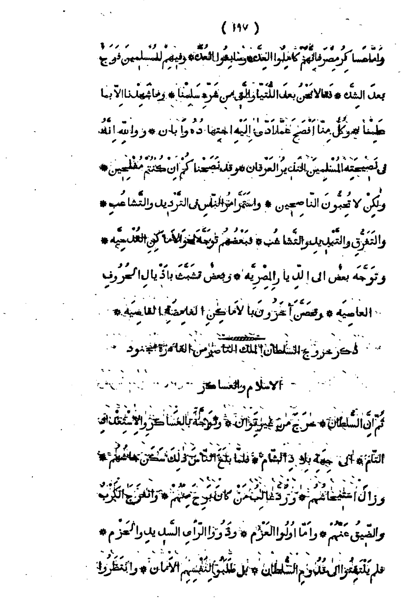 وأما عساكر مصر فإنهم كاملوا العدة و " سابغو " العدة، وفيهم للمسلمين فرج بعد الشدة، فقالا نحن بعد اللتيا والتي من شره سلمنا، وما شهدنا إلا بما علمنا، وكل منا أفصح عما أدى إليه اجتهاده وأبان، والله إنه في نصيحة المسلمين النذير العريان وقد نصحناكم إن كنتم مفلحين، ولكن لا تحبون الناصحين واستمر أمر الناس في الترديد والتشاغب، والتفرق والتبديل والتشاعب، فبعضهم توجه نحو الأماكن القدسية، وتوجه بعض إلى الديار المصرية، وبعض تشبث بأذيال الحروف العاصية، وتحصن آخرون بالأماكن الغامضة القاصية