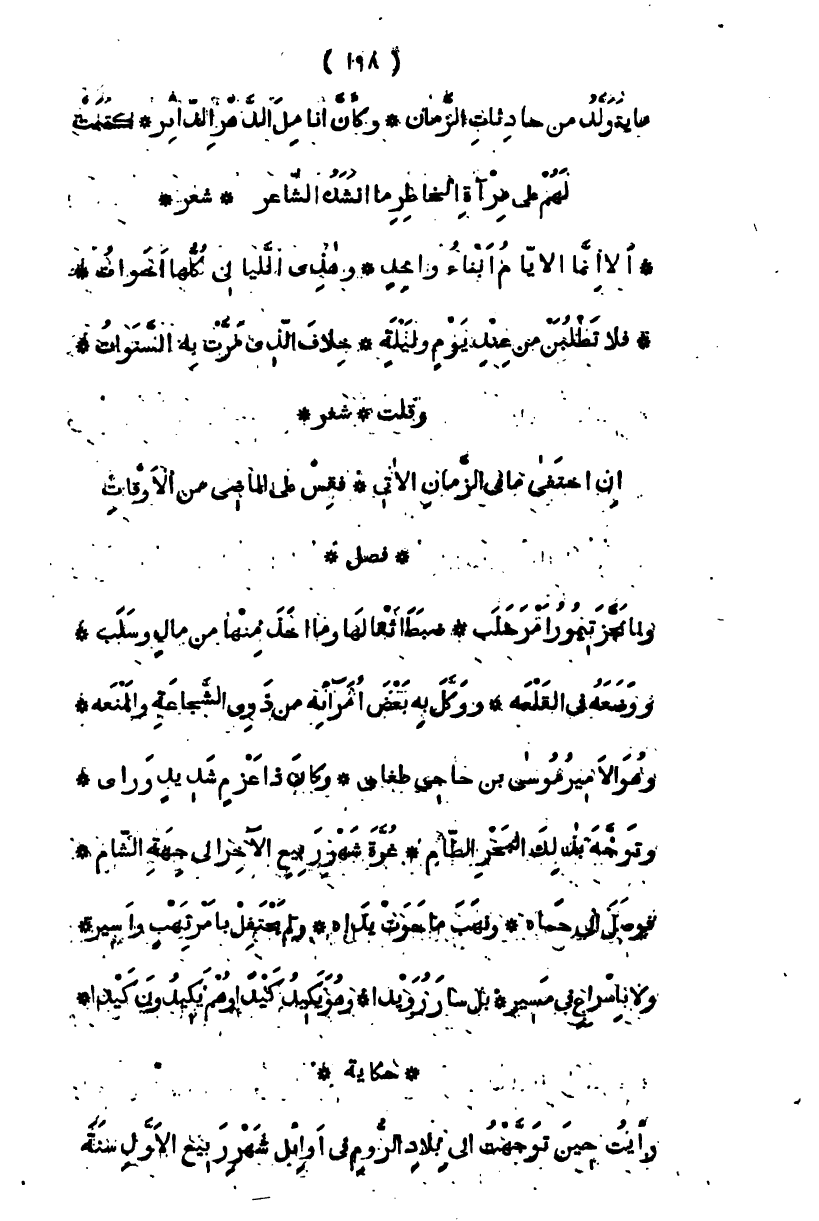 " فصل " ولما أنجز تيمور أمر حلب، ضبط أثقالها وما أخذ منها من مال وسلب، ووضعه في القلعة، ووكل به بعض أمرائه من ذوي الشجاعة والمنعة، وهو الأمير موسى بن حاجي طغاي، وكان ذا عزم سديد ورأي، وتوجه بذلك البحر الطام، غرة شهر ربيع الآخر جهة الشام، فوصل إلى حماة، ونهب ما حوت يداه، ولم يحتفل بأمر نهب وأسير، ولا بإسراع في مسير، بل سار رويدا، وهو يكيد كيدا، ويكيدون كيدا