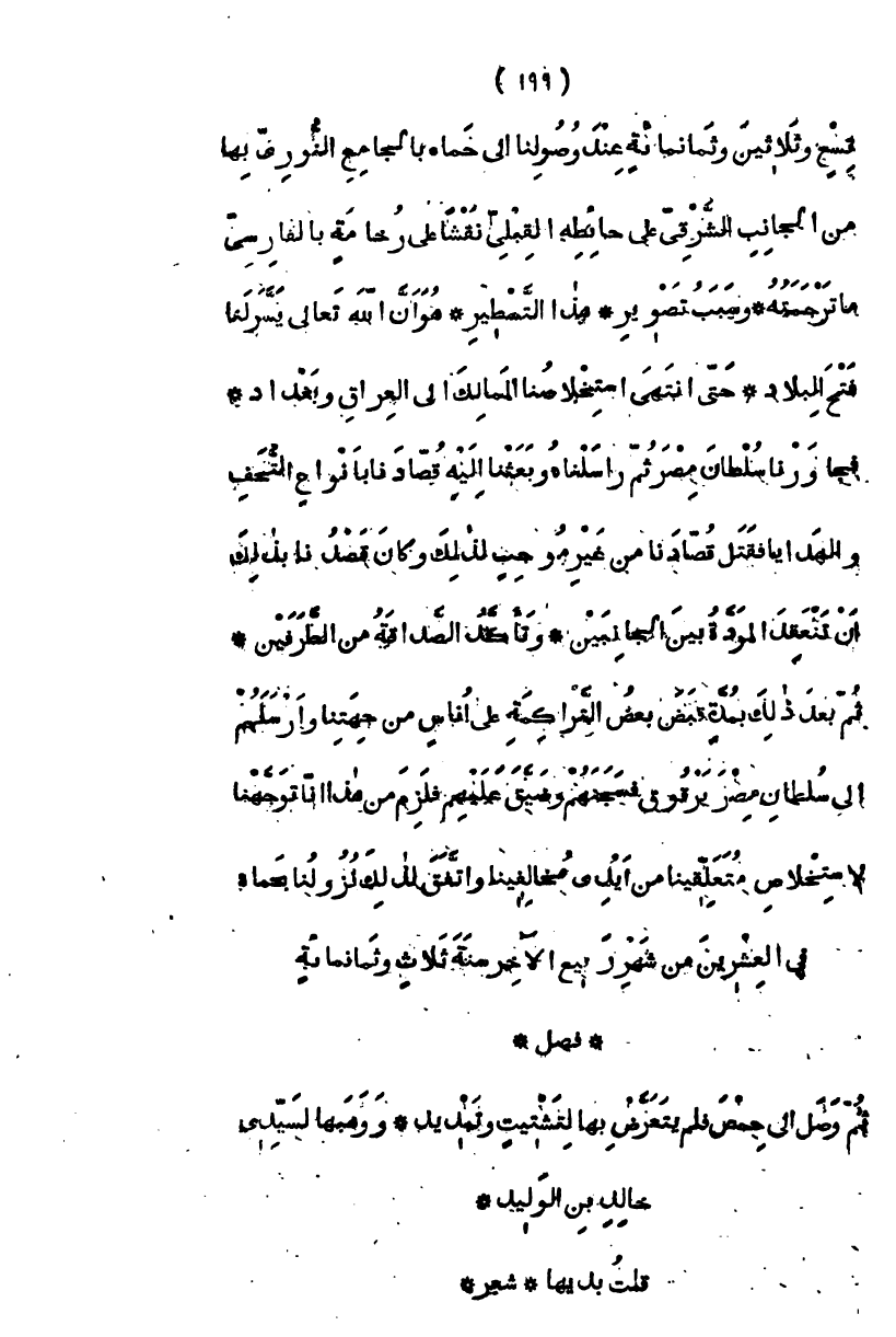 تسع وثلاثين وثمانمائة، عند وصولنا إلى حماة بالجامع النوري بها من الجانب الشرقي على حائطه القبلي نقشاً على رخامة بالفارسي ما ترجمته " وسبب تصوير هذا التسطير، هو أن الله تعالى يسر لنا فتح البلاد والممالك حتى انتهى استخلاصنا الممالك إلى العراق وبغداد، فجاورنا سلطان مصر ثم راسلناه وبعثنا إليه قصادنا بأنواع التحف والهدايا، فقتل قصادنا من غير موجب لذلك، وكان قصدنا بذلك أن تنعقد المودة بين الجانبين، وتتأكد الصداقة من الطرفين ثم بعد ذلك بمدة قبض التراكمة على أناس من جهتنا وأرسلهم إلى السلطان مصر برقوق، فسجنهم وضيق عليهم، فلزم من هذا أنا توجهنا لاستخلاص متعلقينا، من أيدي مخالفينا، واتفق لذلك نولنا بحماه في العشرين من شهر ربيع الآخر سنة ثلاث وثمانمائة " " فصل " ثم وصل إلى حمص فلم يتعرض بها بتشتيت وتبديد، ووهبها لسيدي خالد بن الوليد قلت بديها