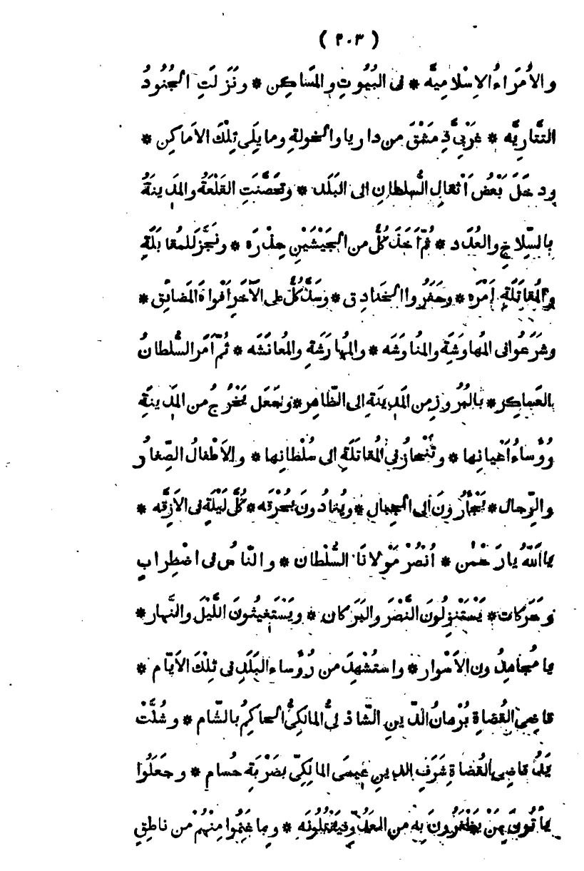 والأمراء الإسلامية في البيوت والمساكن، ونزلت الجنود التتارية غربي دمشق من داريا وإلى قطنا والحولة وما يلي تلك الأماكن ودخل بعض أثقال السلطان إلى البلد، وتحصنت القلعة والمدينة بالسلاح والعدد، ثم أخذ كل من الجيشين حذره، ونجز للمقابلة والمقاتلة أمره، وحفروا الخنادق، وسد كل على الآخر أفواه المضائق، وشرعوا في المهوشة والمناوشة والمهارشة والمعانشة، ثم أمر السلطان العساكر بالبروز من المدينة إلى الظاهر وجعل يخرج من المدينة رؤساء أعيانها، وتنحاز في المقاتلة إلى سلطانها، والأطفال الصغار، يجأرون إلى الجبار، وينادون بحرقة كل ليلة في الأزقة يا الله يا رحمن، انصر مولانا السلطان والناس في اضطراب وحركات، يستنزلون النصر والبركات، ويستغيثون الليل والنهار، يا مجاهدون الأسوار واستشهد من رؤساء البلد في تلك الأيام قاضي القضاة برهان الدين التادلي المالكي الحاكم بالشام، وشلت يد قاضي القضاة شرف الدين عيسى المالكي بضربة حسام، وجعلوا يأتون بمن يظفرون به من العدو فيقتلونه، ربما غنموا منهم من ناطق