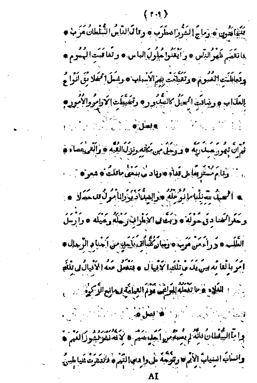 وحفر الخنادق حوله، وبث في الأطراف رجله وخيله، وأرسل الطلب وراء من هرب، وصار كلما أتى بأحد من أجناد الرجال، أمر بإلقائه بين يدي تلك الأفيال، فتفعل معه الأفيال في تلك الفلاة، ما تفعله المواشي يوم القيامة في مانع الزكاة " فصل " فأما السلطان فإنه لم يصبه من أحد ضيم لأنه نشز نشوز الغيم وانساب انسياب الأيم، وتوجه على وادي التيم، فانتشرت شياطين