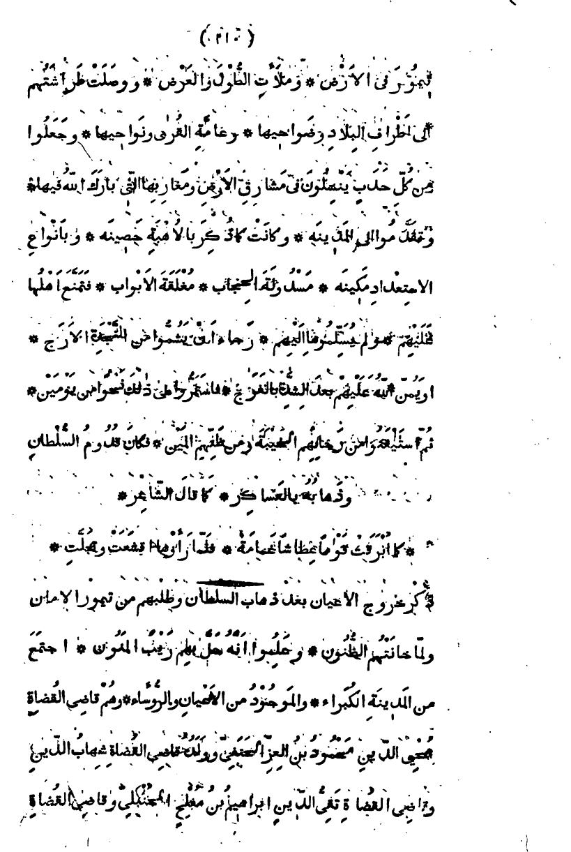 تيمور في الأرض، وملأت الطول والعرض، ووصلت طراشتهم إلى أطراف البلاد وضواحيها، وعامة القرى ونواحيها، وجعلوا من كل حدب ينسلون في مشارق الأرض ومغاربها التي بارك الله فيها وتقدموا إلى المدينة، وكانت كما ذكر بالأهبة حصينة، وبأنواع الاستعداد مكينة، مسدولة بالحجاب، مغلقة الأبواب، فتمنع أهلها عليهم، ولم يسلموها إليهم، رجاء أن يشموا من النجدة الأرج، أو يمن الله عليهم بعد هذه الشدة بفرج، فاستمروا على ذلك نحواً من يومين، ثم استيقنوا من رجائهم الخيبة ومن ظنهم المين، فكان قدوم السلطان وذهابه بالعساكر كما قال الشاعر