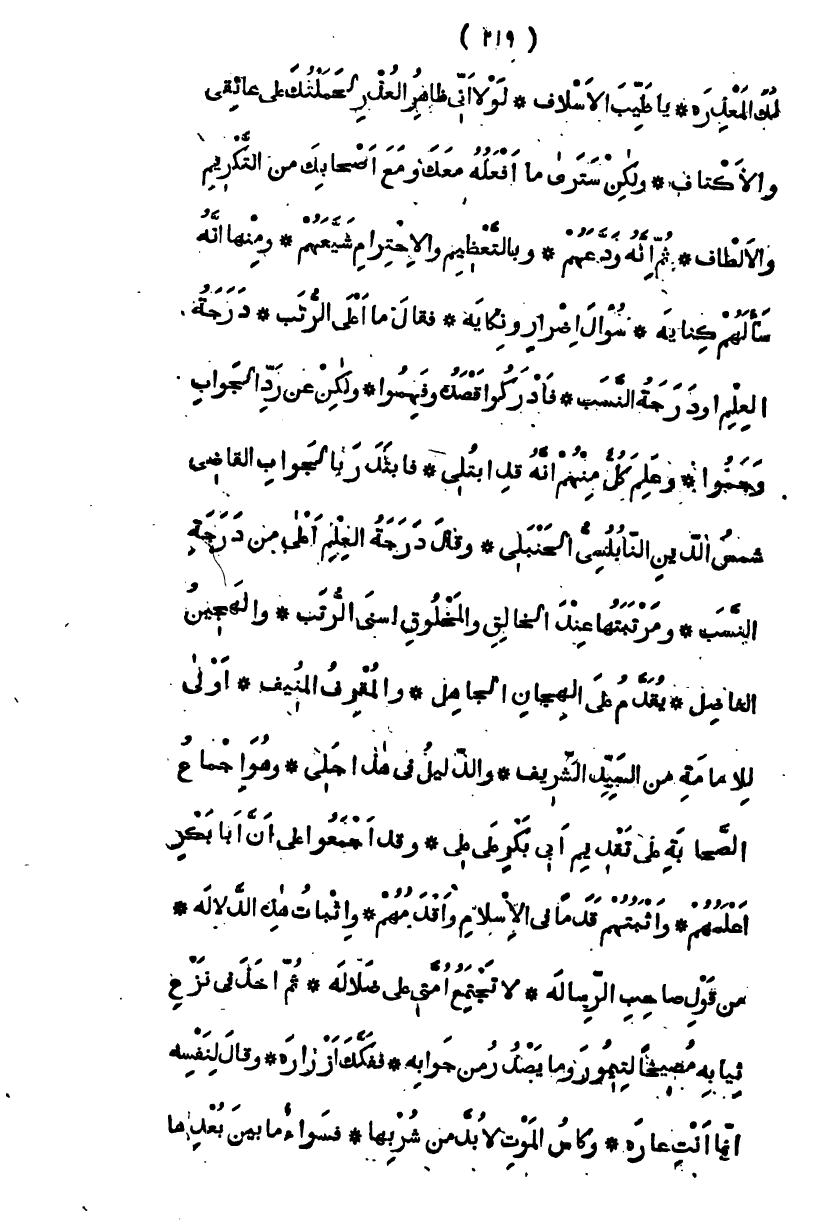 له المعذرة يا طاهر الأسلاف، لولا أني ظاهر العذر لحملتك على عاتقي والأكتاف، ولكن سترى ما أفعله معك ومع أصحابك من التكريم والألطاف، ثم إنه ودعهم، وبالتعظيم والاحترام شيعهم ومنها أنه سألهم كناية، سؤال إضرار ونكاية، فقال ما أعلى الرتب، درجة العلم أو درجة النسب؟ فأدركوا قصده وفهموا، ولكن عن رد الجواب وجموا، وعلم كل منهم أنه قد أبتلي، فابتدر الجواب القاضي شمس الدين النابلسي الحنبلي، وقال درجة العلم أعلى من درجة النسب، ومرتبتها عند الخالق والمخلوق أسنى الرتب، والهجين الفاضل يقدم على الهجان الجاهل، والمقرف المنيف، أولى للإقامة من النسيب الشريف، والدليل في هذا جلي، وهو إجماع الصحابة في تقديم أبي بكر على علي، وقد أجمعوا أن أبا بكر أعلمهم، وأثبتهم قدماً في الإسلام وأقدمهم، وإثبات هذه الدلالة، من قول صاحب الرسالة لا تجتمع أمتي على ضلالة