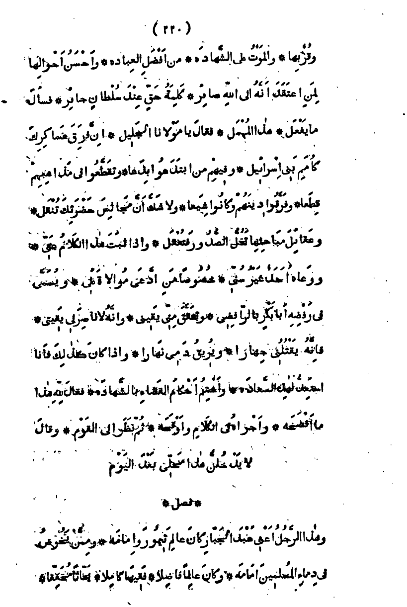 وقربها، والموت على الشهادة، من أفضل العبادة، وأحسن أحوالها لمن اعتقد أنه إلى الله صائر، كلمة حق عند سلطان جائر، فسأل ما يفعل، هذا المهمل، فقال يا مولانا الجليل، إن فرق عساكرك كأمم بني إسرائيل، وفيهم من ابتدعوا بدعا وتقطعوا في مذاهبهم قطعا، وفرقوا دينهم وكانوا شيعا، ولا شك أن مجالس حضرتك تنقل، وعقائل مباحثها تحل الصدور فتعقل، وإذا ثبت هذا الكلام عني، ووعاه أحد غير سني، خصوصاً من ادعى موالاة علي، وتسمى في رفضه أبا بكر بالرافضي، وتحقق مني يقيني، وأنه لا ناصر لي يقيني، فإنه يقتلني جهارا، ويريق دمي نهارا، وإذا كان كذلك فأنا أستعد لهذه السعادة، وأختم أحكام القضاء بالشهادة، فقال لله هذا! ما أفصحه! وأجرأه في الكلام وأوقحه، ثم نظر إلى القوم، وقال لا تدخلن هذا علي بعد اليوم " فصل " وهذا الرجل أعني عبد الجبار كان عالم تيمور وإمامه، وممن يخوض في دماء المسلمين أمامه، وكان عالماً فاضلا، فقيهاً كاملا، بحاثاً محققاً،