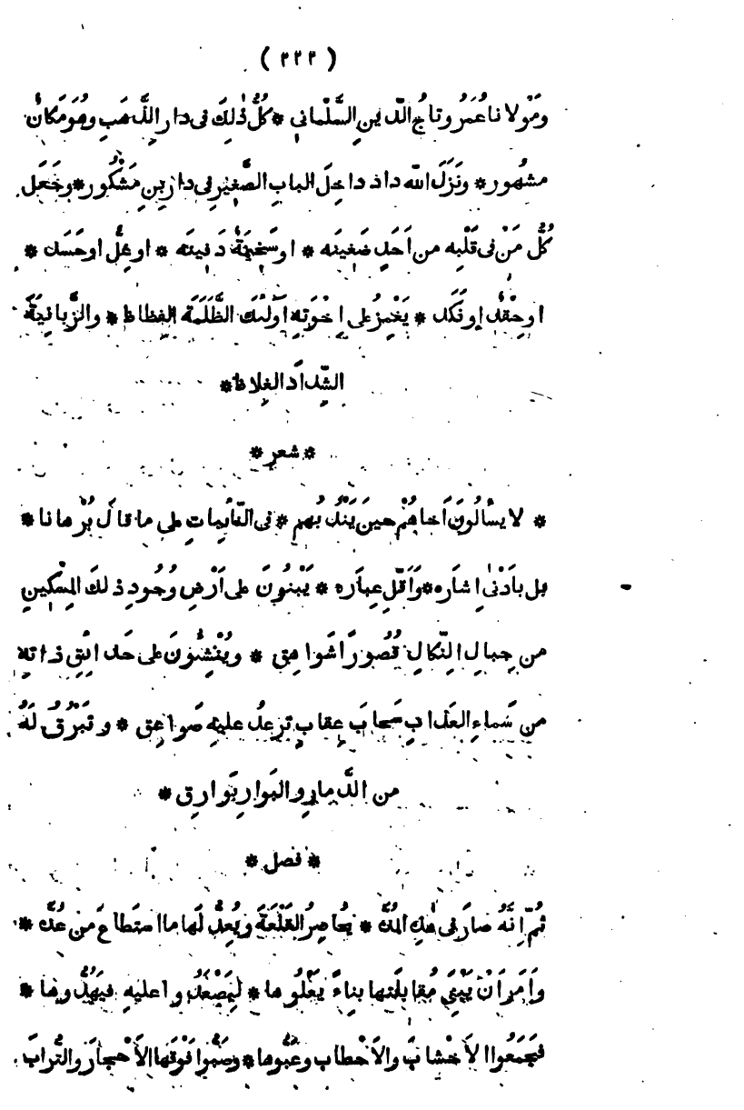 بل بأدنى إشارة، وأقل عبارة، يبنون على أرض وجود ذلك المسكين من جبال النكال قصور شواهق، وينشئون على حدائق ذاته من سماء العذاب سحاب عقاب ترعد عليه صواعق، وتبرق منه من الدمار والبوار بوارق " فصل " ثم إنه صار في هذه المدة، يحاصر القلعة ويعد لها ما استطاع من عدة، وأمر أن يبني مقابلها بناء يعلوها، ليصعدوا عليها فيهدوها، فجمعوا الأخشاب والأحطاب وعبوها وصبوا فوقها الأحجار والتراب