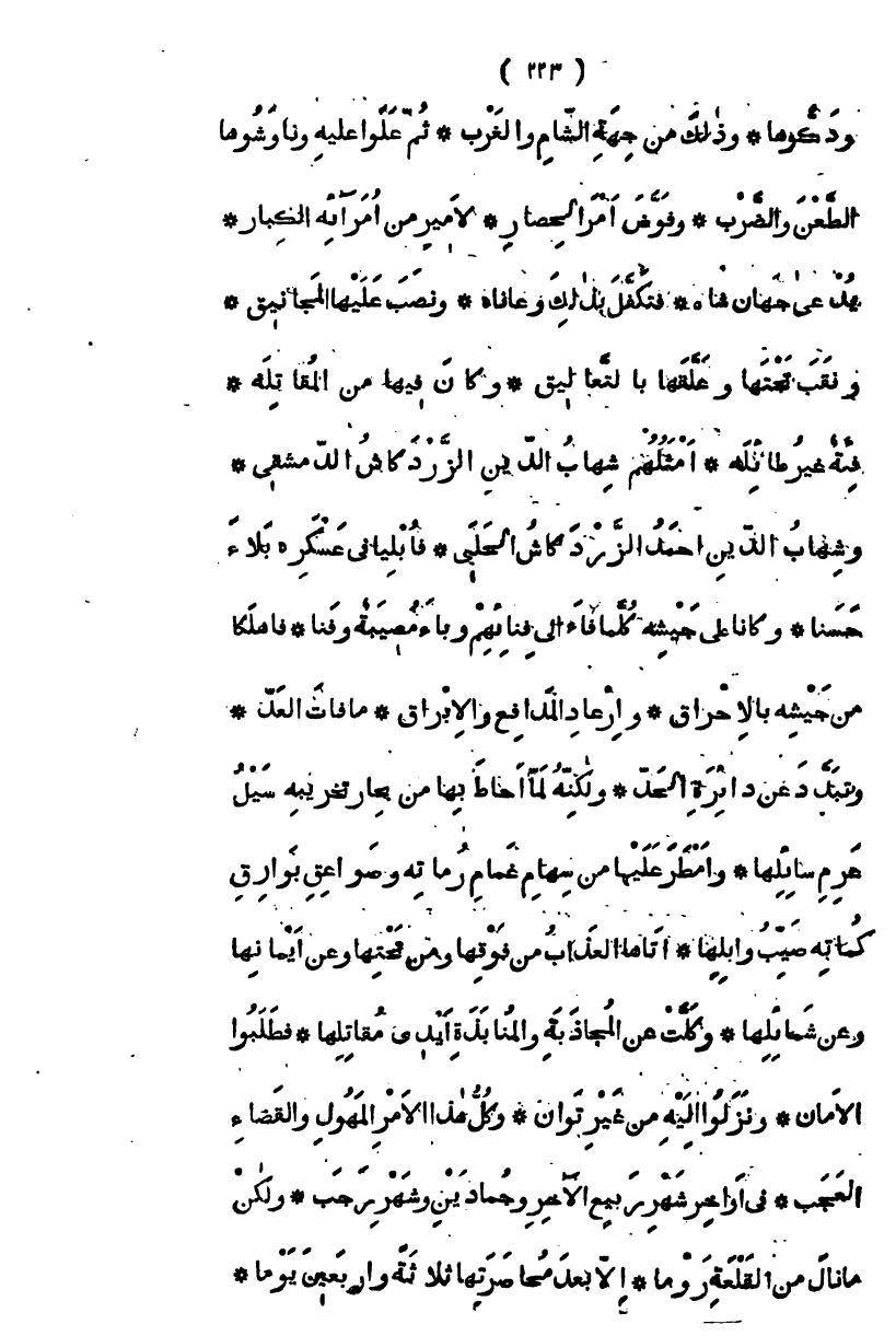 ودكوها، وذلك من جهة الشمال والغرب، ثم علوا عليها وناوشوها الطعن والضرب، وفوض أمر الحصار لأمير من أمرائه الكبار، يدعى جهان شاه، فتكفل بذلك وعاناه، ونصب عليه المجانيق، ونقب تحتها وعلقها والتعاليق، وكان فيها من المقاتلة، فئة غير طائلة، أمثلهم شهاب الدين الزردكاش الدمشقي وشهاب الدين أحمد الزردكاش الحلبي، فأبليا في إهلاك عسكره بلاء حسنا، وكان على جيشه كلما فاء إلى فنائهم وباء مصيبة وفنا، فأهلكا من جيشه بالإحراق، وإرعاد المدافع والإبراق، ما فات العد، وتبدد على دائرة الحد ولكنه لما أحاط بها من بحار بحريته سيل عرم سائلها، وأمطر عليها من سهام غمام رماته وصواعق بوارق كماته صيب وابلها، أتاها العذاب من فوقها ومن تحتها وعن أيمانها وعن شمائلها، وكلت عن المجاذبة والمنابذة أيدي مقاتلتها