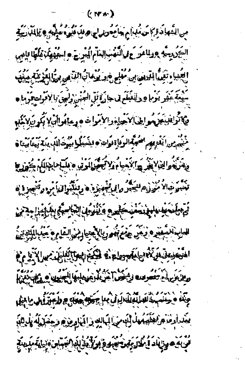 من الشهادة كأس مدام جاءه وراح، فدفنوه عشية، بالمدرسة الكروسية ولما شرع في النهب العام المبرح، استشهد غلطاً قاضي القضاة تقي الدين ابن مفلح، وبرهان الدين بن القوشة، ضعف سبعة عشر يوماً، وانقطع في حارة تل الجبن ولحق بالأموات قوماً، وكانوا قد حرجوا على الأحياء والأموات، وخافوا أن لا يكون لأحد من أيديهم بحجة الوفاة فوات، فضبطوا بيوت المدينة بيتاً بيتاً، وحرجوا أن لا تخرج الأحياء ولا تجهيز الموتى، فلما مات المذكور تعسرت الأمور، فتحيروا في تجهيزه، وتغلبوا في أمره وتنجيزه، ثم بعد جهد بليغ وسعي كثير، دفنوه في الصالحية بعد إخراجه من باب الصغير وخرج مع تيمور بالاختيار من الشام عبد الملك بن التكريتي، فولاه نيابة سيرام، فمكث فيها القليل من الأيام، وهي وراء سيحون، وشخص آخر يدعى بيلبغا المجنون، وكان مقرباً عنده، وسبب ذلك أنه بذل في مناصحته جهده، وأخبره على ما قيل بفداوى، فخلصه بذلك من المهالك والمهاوي، وحصل له بذلك قربة، وزيادة ملازمة وصحبة، فولاه ذلك الجاس، نيابة مدينة