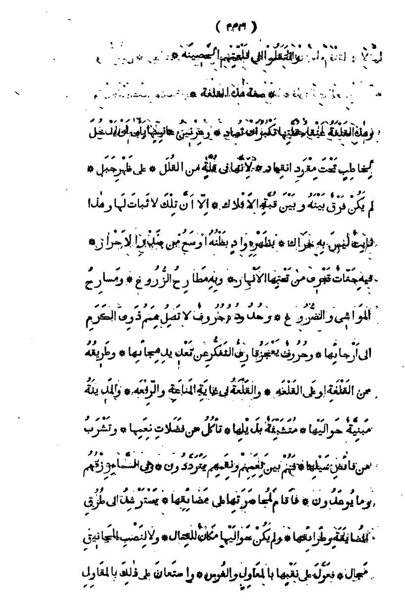وهذه القلعة عنقاء قلتها تكبر أن تصاد، وعرنين عانسها يأبى أن يدخل لخاطب تحت مقود انقياد، لأنها في قلة من القلل، على ظهر جبل، لم يكن فرق بينه وبين قبة الأفلاك، إلا أن تلك لا ثبات لها وهذا ثابت ليس به حراك، بظهره واد بطنه أوسع من صدر الأحرار، فيه جنات تجري من تحتها الأنهار، وبه مطارح الزروع، ومسارح المواشي والضروع، وحدود جروف لا تصل همم ذوي الكرم إلى أرجائها، وحروف يعجز قارئ التفكير عن تعديد هجائها، وطريقه من القلعة أو على القلعة، والقلعة في غاية المناعة والرفعة، والمدينة مبنية حواليها، متشبثة بذيلها، تأكل من فضلات نعمها، وتشرب من فائض سيلها، فهم بين نعمهم ونقمهم يترددون، وفي السماء رزقهم وما يوعدون فأقام لمحاصرتها على مضائقها، يسترشد إلى طرق المضايقة وطرائقها، ولم يكن حواليها مكان للقتال، ولا لنصب المجانيق مجال، فعول على نقبها بالمعاول والفؤوس، واستعان على ذلك بالمقاول