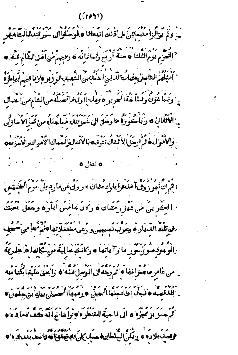 ولم يزالوا منبعثين على ذلك انبعاثاً، فوصلوا إلى سمرقند ثالث عشر المحرم يوم الثلاثاء، سنة أربع وثمانمائة، وفيهم من أهل الشام فئة، أمثلهم القاضي شهاب الدين أحمد بن الشهيد الوزير، وباقيهم بياطرة، وصباغون ونساجة الحرير، وهذا أول ما تحمله من الشام من أحمال الأثقال، وباكورة ما وصل إلى سمرقند مما جناه من ثمر الأساري والأموال، ثم أرسل الأثقال تترى، بالأنفال وأحمال الأموال والأسرى " فصل " ثم إن تيمور ولى آمد قرايلوك عثمان، وولى عن ماردين يوم الخميس العشرين من شهر رمضان، وكان خامس أيار، وجعل يعيث في تلك الديار، وخرب نصيبين ورعى مستغلاتها، ثم محا من صحف الوجود صور سورها وآياتها، وكانت خالية من سكانها خاوية من عامري عمرانها، ثم وجه إلى الموصل همه، وأخنى عليها بكتائبه المدلهمة، فبعد أن أحلها الحين وهبها لحسين بك بير حسين، ثم جمز بزمجره، ناحية القنطرة، وأشاع أنه كف فساده، وقصد بلاده، ولكن السلطان أحمد كان قد تحقق أنه قاصد بغداده،