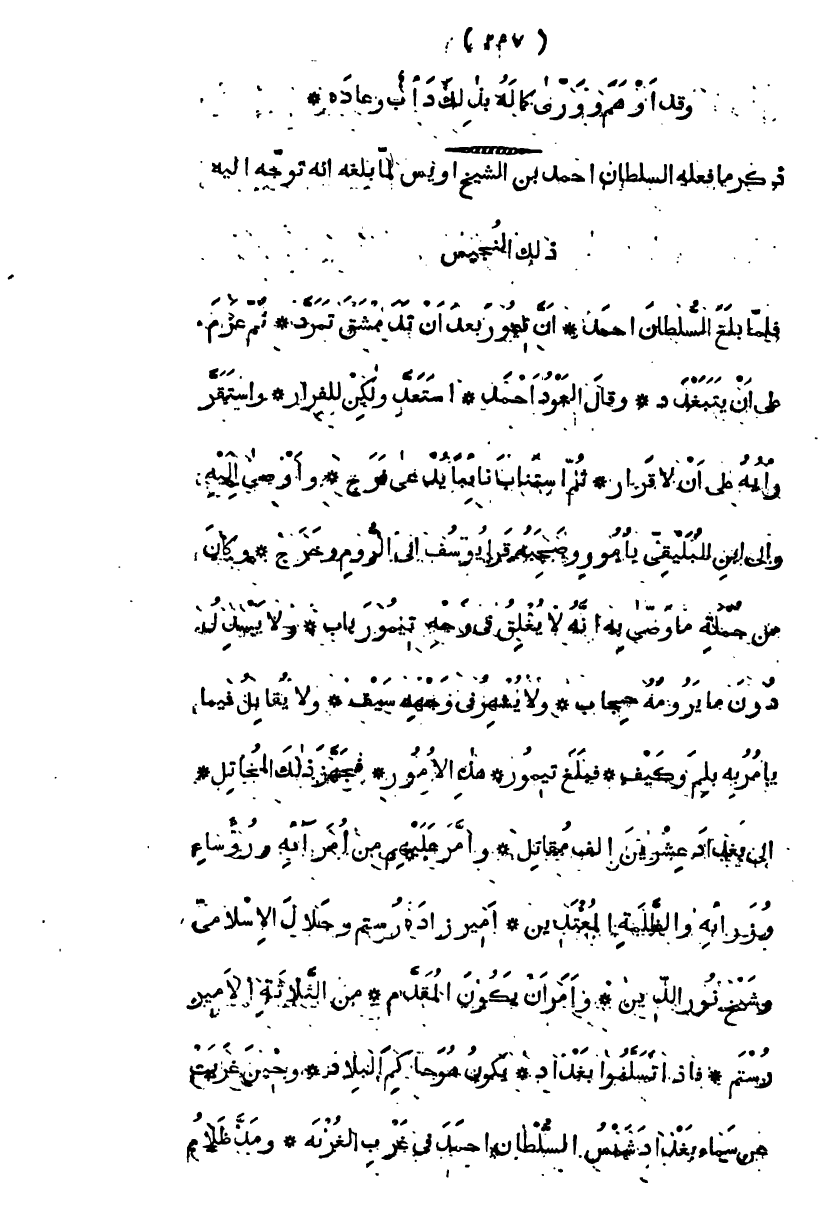 فلما بلغ السلطان أحمد أن تيمور بعد أن تدمشق تمرد، ثم عزم على أن يتبغدد، وقال العود أحمد، استعد ولكن للفرار، واستقر رأيه على أن لا قرار، ثم استناب نائباً يدعى فرج، وأوصى إليه وإلى ابن البليقي بأمور وصحبة قرا يوسف إلى الروم خرج، وكان من جملة ما وصى به أن لا يغلق في وجه تيمور باب، ولا يسدل دون ما يرومه حجاب، ولا يشهر في وجهه سيف، ولا يقابل فيما يأمر به بلم وكيف فبلغ تيمور هذه الأمور، فجهز ذلك المخاتل، إلى بغداد عشرين ألف مقاتل، وأمر عليهم من أمرائه، ورؤساء وزرائه، والظلمة المعتدين، أمير زاده رستم وجلال الإسلامي وشيخ نور الدين، وأمر أن يكون المقدم، من الثلاثة الأمير رستم، فإذا تسلموا بغداد، يكون هو حاكم البلاد، وحين غربت عن سماء بغداد شمس السلطان أحمد في غرب الغربة، ومد ظلام