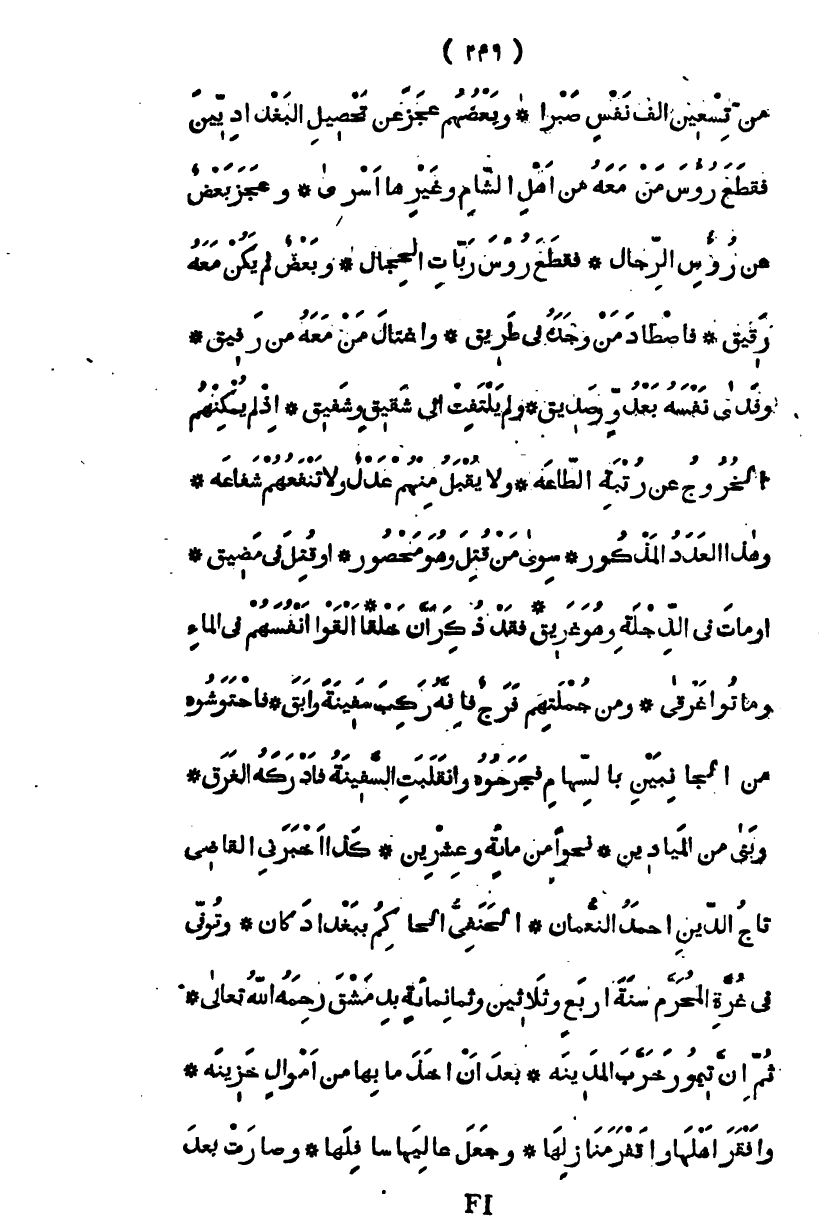 من تسعين ألف نفس صبراً، وبعضهم عجز عن تحصيل البغدادين فقطع رؤوس من معه من أهل الشام وغيرها أسرى، وعجز بعض عن رؤوس الرجال، فقطع رؤوس ربات الحجال، وبعض لم يكن معه رقيق، فاصطاد من وجده في طريق، أو اغتال من معه من رفيق، وفدى نفسه بعدو وصديق، ولم يلتفت إلى شفيق وشقيق، إذ لم يمكنهم الخروج عن ربقة الطاعة، ولا يقبل منهم عدل ولا تنفعهم شفاعة وهذا العدد المذكور، سوى من قتل وهو محصور أو قتل في مضيق، أو مات في الدجلة وهو غريق، فقد ذكر أن خلقاً ألقوا أنفسهم في الماء وماتوا غرقى، ومن جملتهم فرج فإنه ركب سفينة وأبق، فاحتوشوه من الجانبين بالسهام فجرحوه وانقلبت السفينة فأدركه الغرق، فبنى من المآذين نحواً من مائة وعشرين، كذا أخبرني القاضي تاج الدين أحمد والنعمان الحنفي الحاكم ببغداد كان، وتوفى غرة المحرم سنة أربع وثلاثين وثمانمائة بدمشق رحمه الله تعالى ثم إن تيمور خرب المدينة، بعد أن أخذ ما بها من أموال خزينة، وأفقر أهلها، وأقفر منازلها، وجعل عاليها سافلها، وصارت بعد