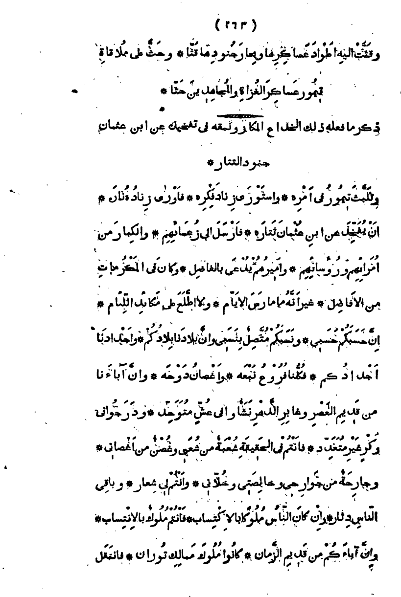 وتلبث تيمور في أمره، واستورى زناد فكره، فأورى زناده ناره، أن يفخذ عن ابن عثمان تتاره، فأرسل إلى زعمائهم، والكبار من أمرائهم ورؤسائهم، وأميرهم يدعى بالفاضل، وكان في المكرمات من الأفاضل، غير أنه مارس الأيام، ولا اطلع إلى مكائد اللئام - إن حسبكم حسبي، ونسبكم متصل بنسبي، وإن بلادنا بلادكم، وأجدادنا أجدادكم، فكلنا فروع نبعه، وأغصان دوحه، وإن آباءنا من سالف العصر وغابر الدهر نشأوا في عش متوحد، ودرجوا في وكر غير متعدد، فأنتم في الحقيقة شعبة من شعبي، وغصن من أغصاني، وجارحة من جوارحي، وخالصتي وخلاني، وأنتم لي شعار، وباقي الناس دثار، وإن كان الناس ملوكاً بالاكتساب، فأنتم ملوك بالاكتساب والانتساب وإن آباءكم في قديم الزمان، كانوا ملوك ممالك توران، فانتقل